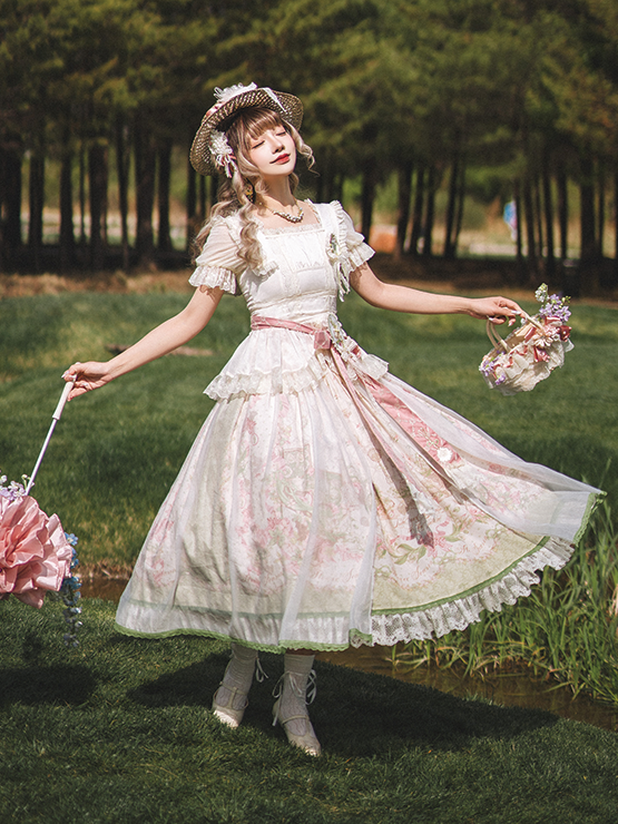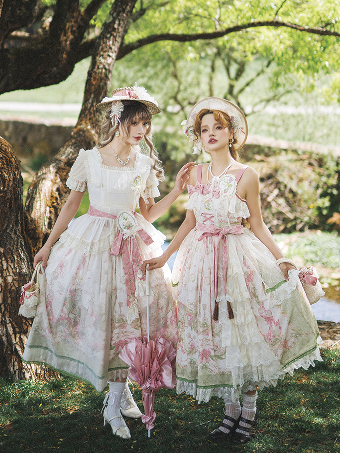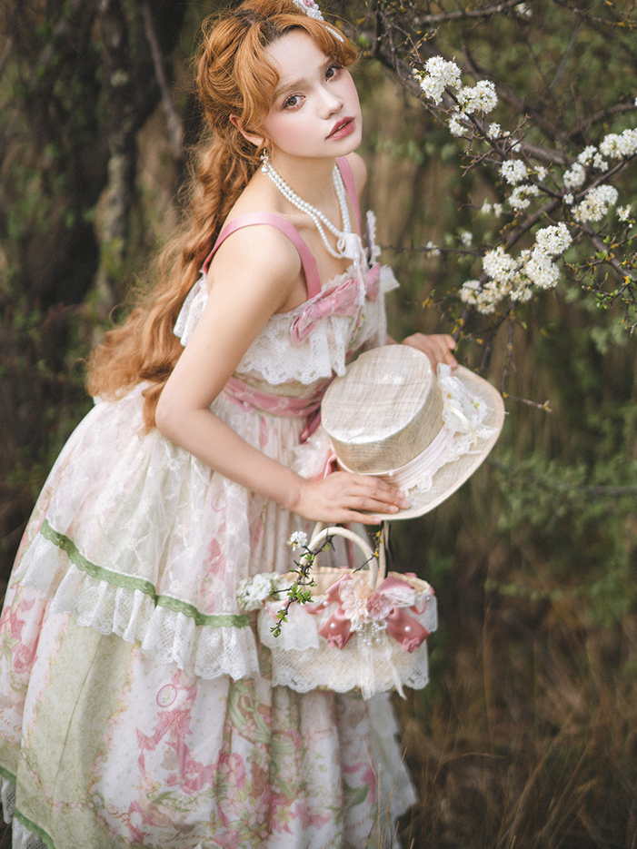 ピンクと白のオールドスクールロリータファッションドレス、蝶結びディテール、ロリータJSKセット