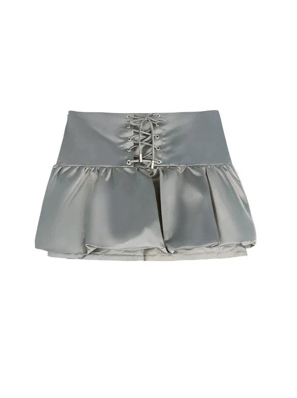 バルーンスカートで、ファッションステートメントを演出しましょう!光沢のあるダークカラーの生地を使用し、キュートなレースアップデザインがポイント。このスカートで遊び心をアピールすれば、きっと注目を集めること間違いなしです。