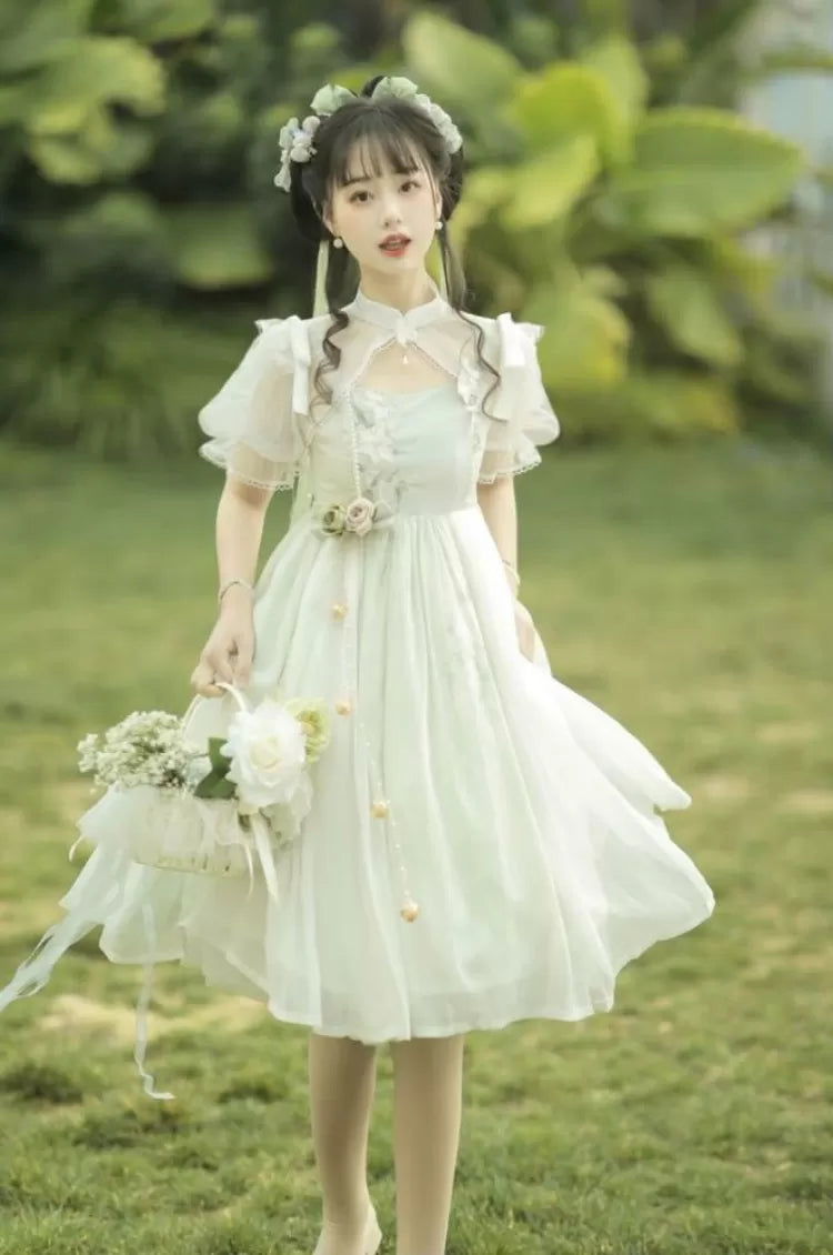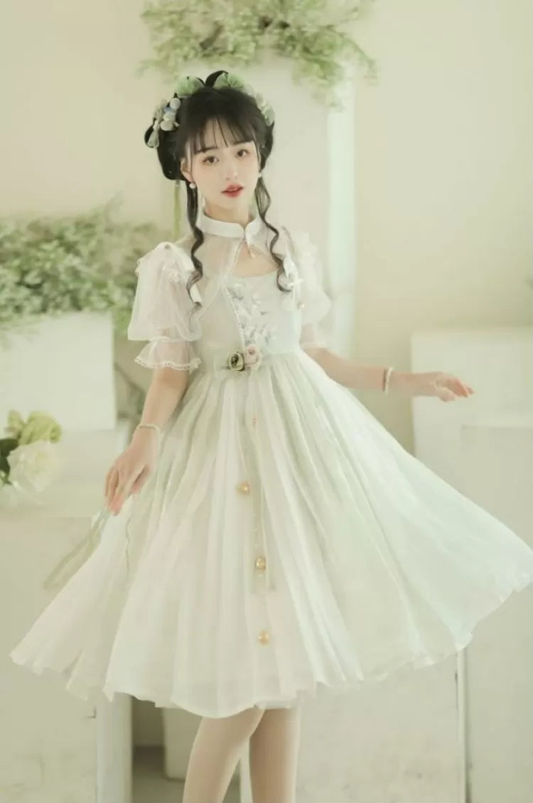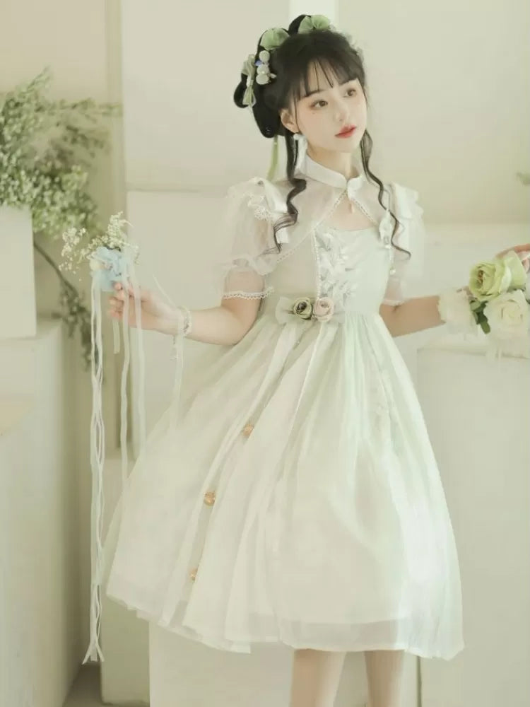 グリーンの花柄刺繍ドレス + ホワイトのバンドカラートップス