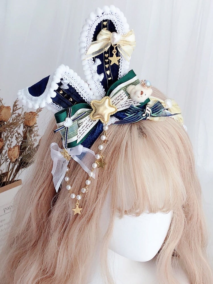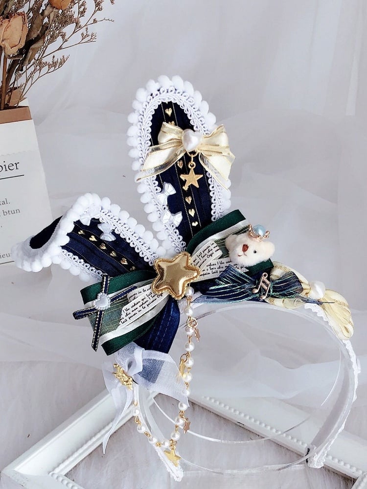 グリーン/ブラック&ピンクのぬいぐるみクマと星で飾られたビーズチャームのウサギの耳KC