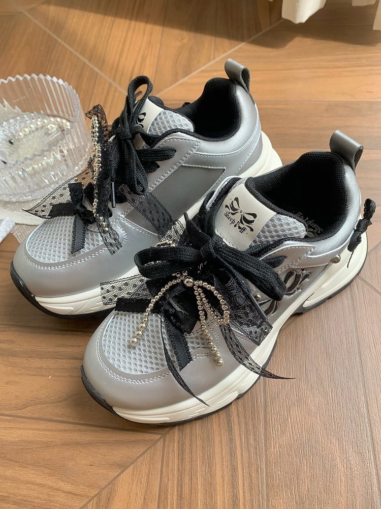 ビーズフロントタイ ブラック 蝶結び レースアップ 装飾ディテール スニーカー