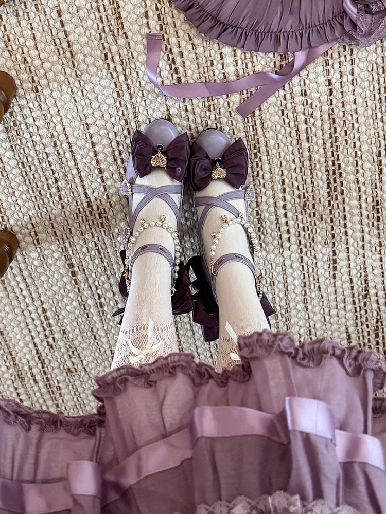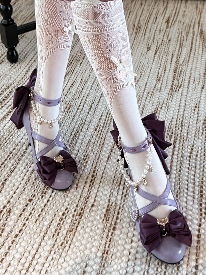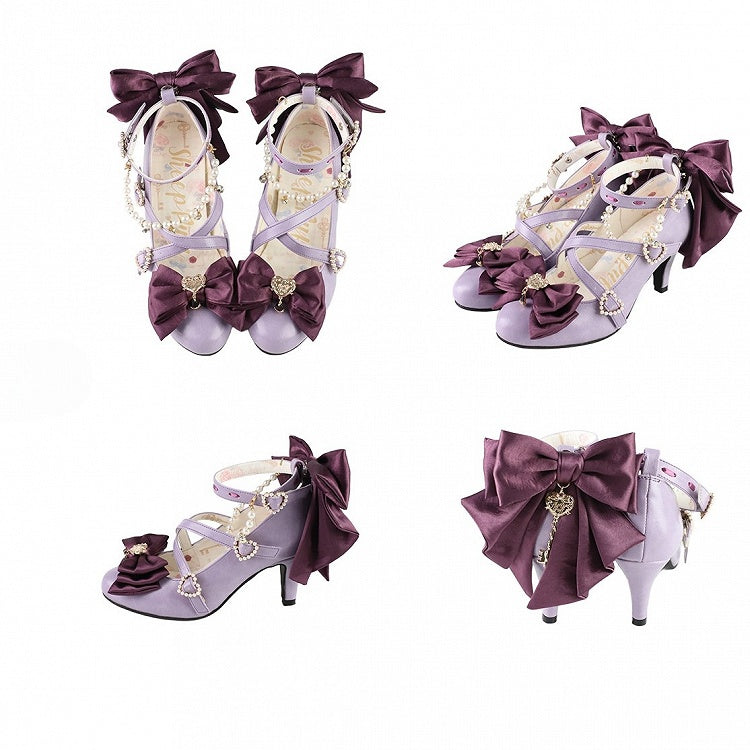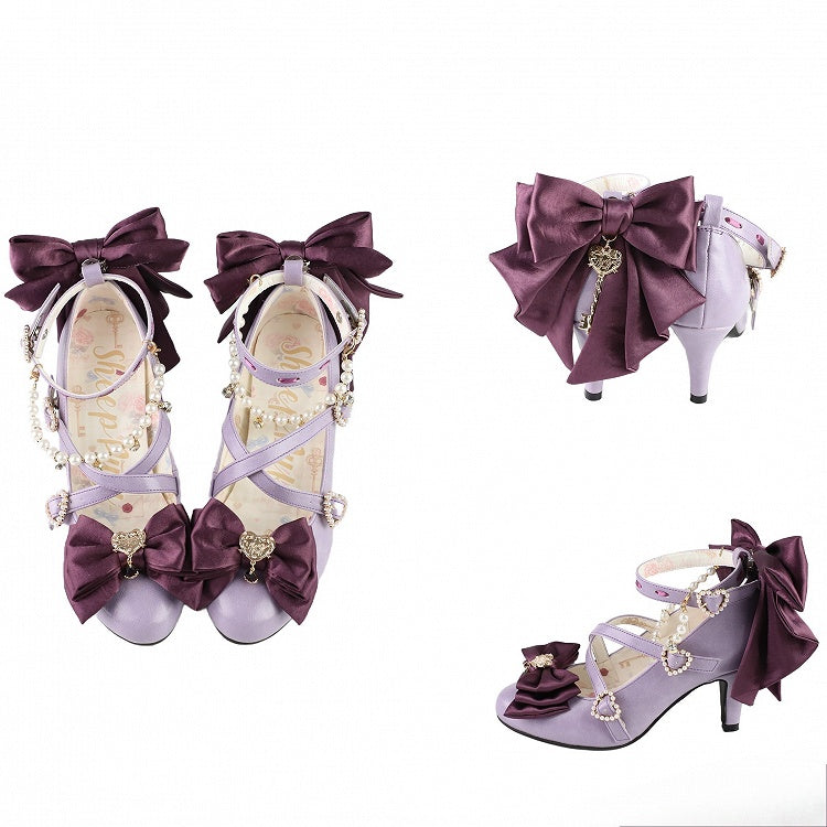 紫色のビーズチャームとハート型の装飾リボンがトップについたクロスデザインのハイヒール