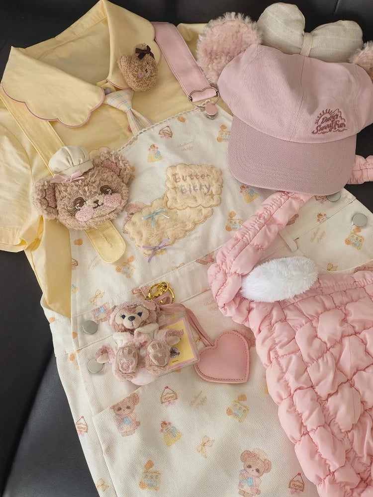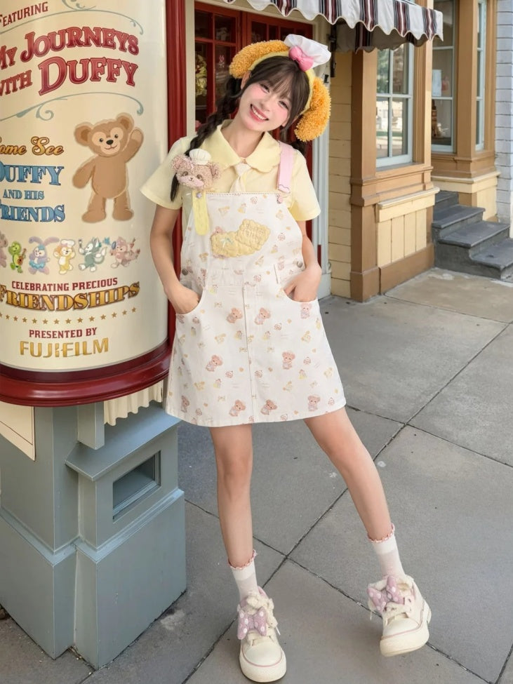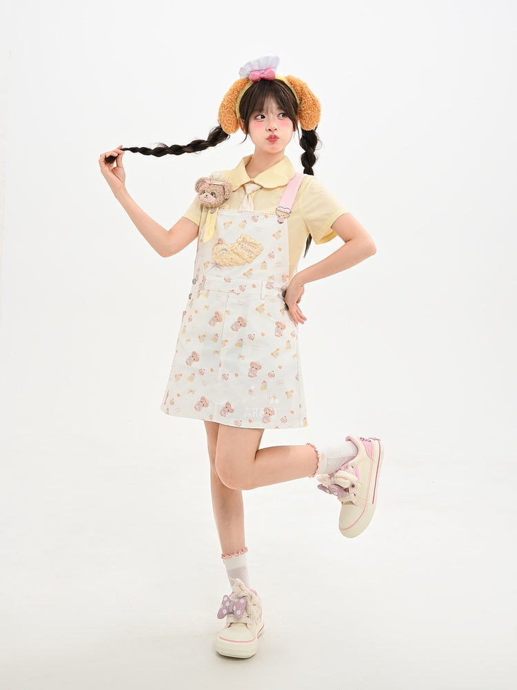 クマの刺繍アップリケ付きホワイトぬいぐるみクッキーとプリント総柄オーバーオールスカート