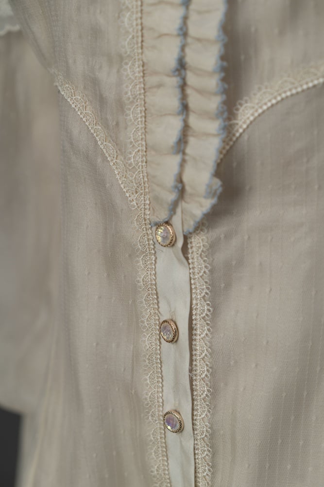 ベージュとブルーのフリルクロスオーバーネックライン長袖シャツ