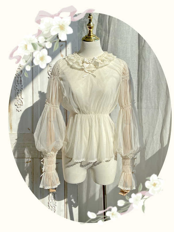 ベージュのセミシースルーレッグオブマトンスリーブブラウス