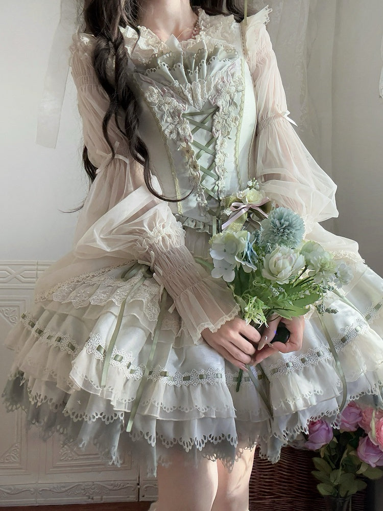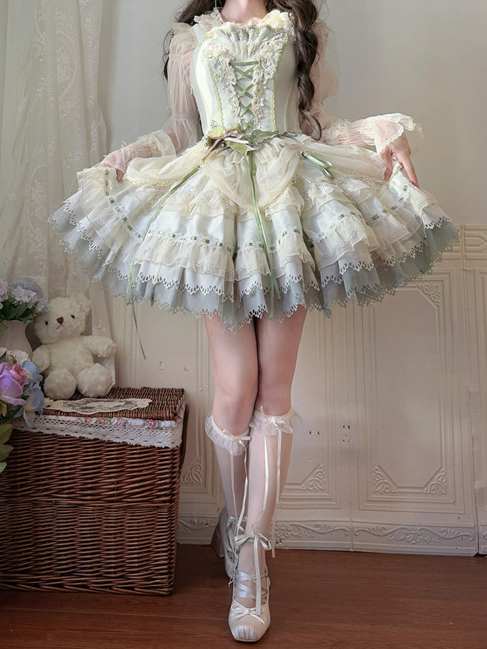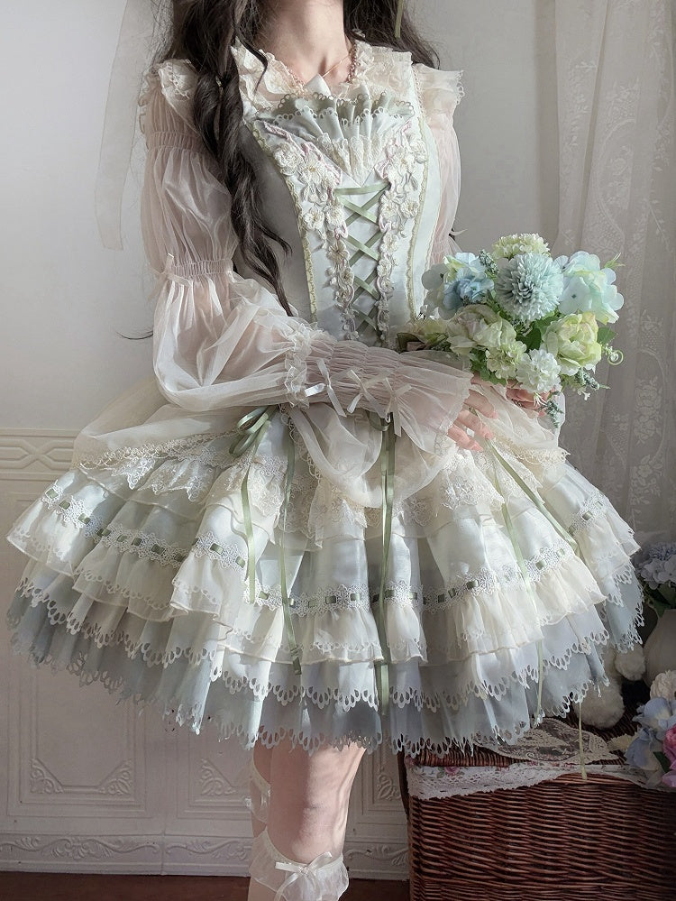 青と白のオールドスクールロリータファッションドレス 蝶結びディテール JSK セット
