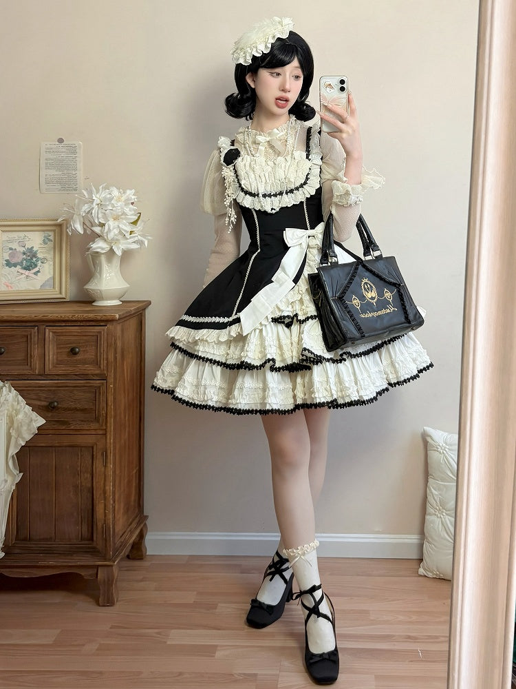 黒とベージュのエレガントなスリムフィットウエストティアードスカートロリータジャンパースカート