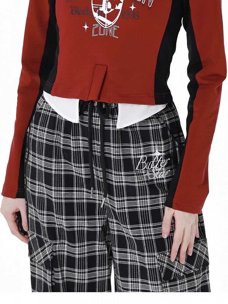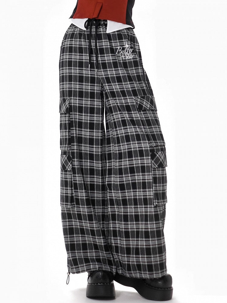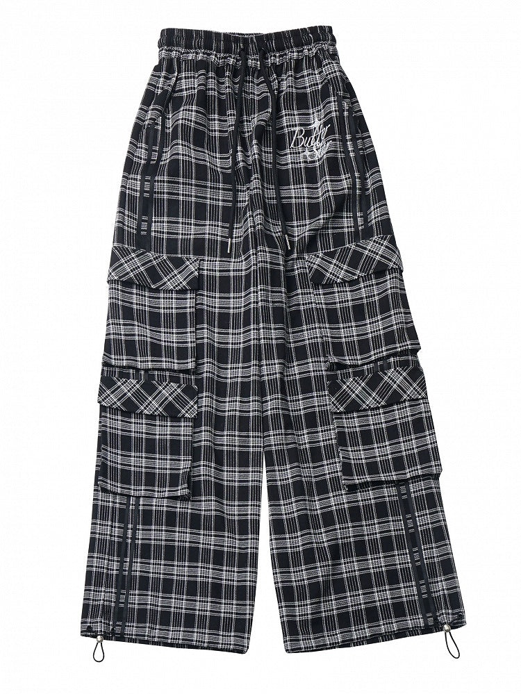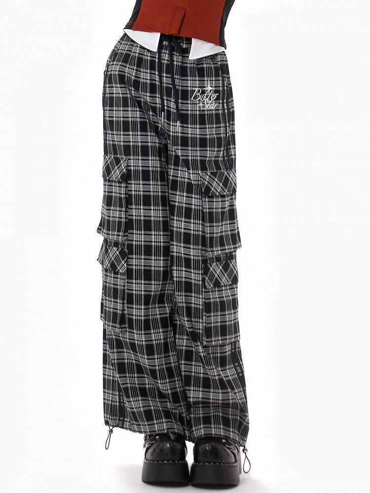 ブラックとグレーの文字が入ったカーゴポケットデザインのチェック柄パンツは、ワードローブにキュートなスタイルをプラスするのにぴったりです。便利なカーゴポケットとトレンドのチェック柄が、スタイリッシュで整理整頓された印象を演出します。