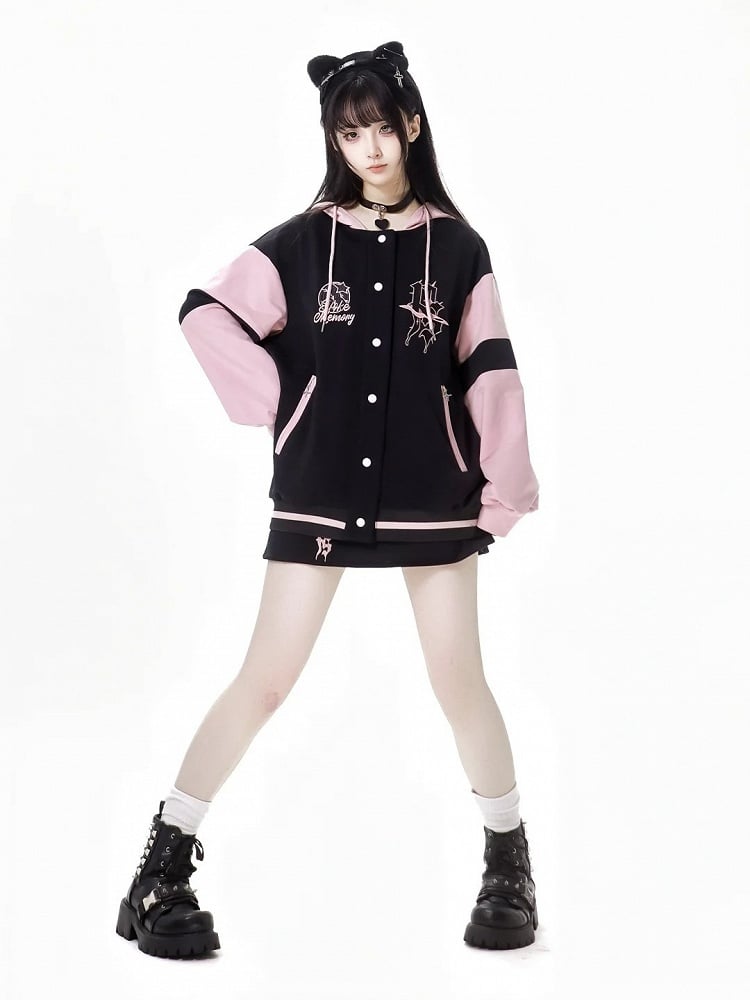 この愛らしいベースボールジャケットは、ショート丈とロング丈の2種類があり、黒とピンクの絶妙な組み合わせが魅力です。フード付きで暖かくスタイリッシュに着こなせるだけでなく、自分にぴったりの丈を選べる万能さも魅力です。