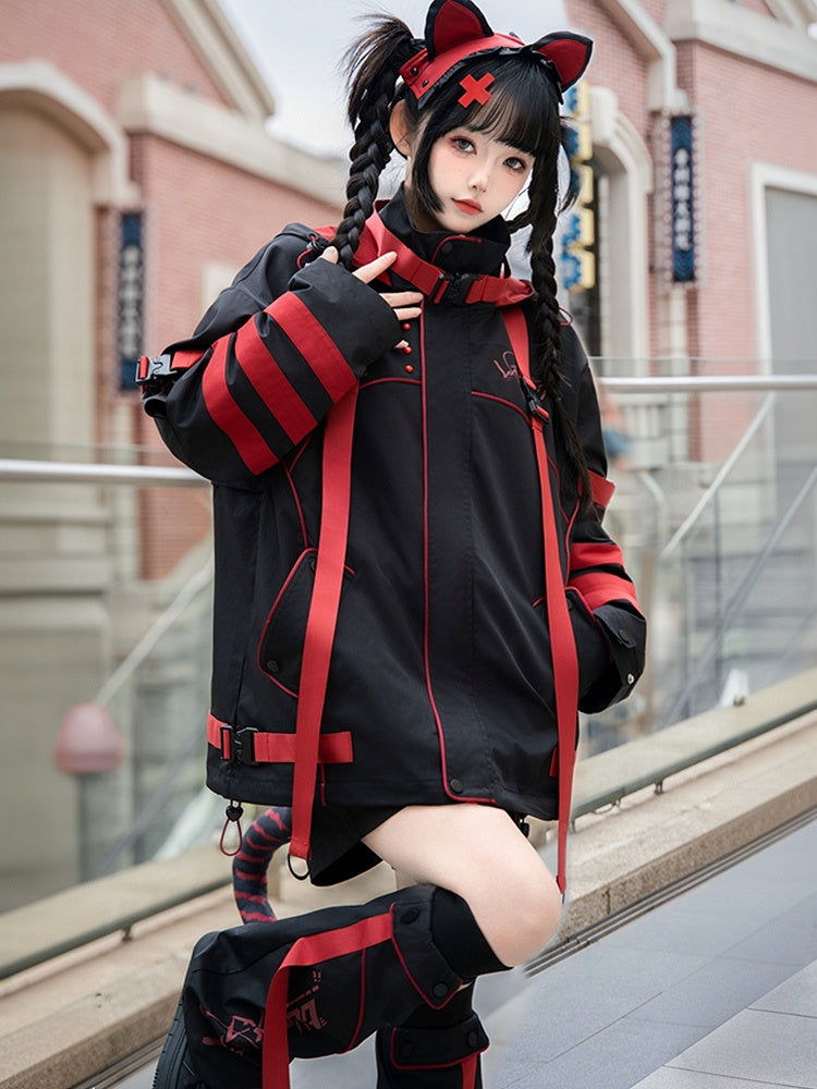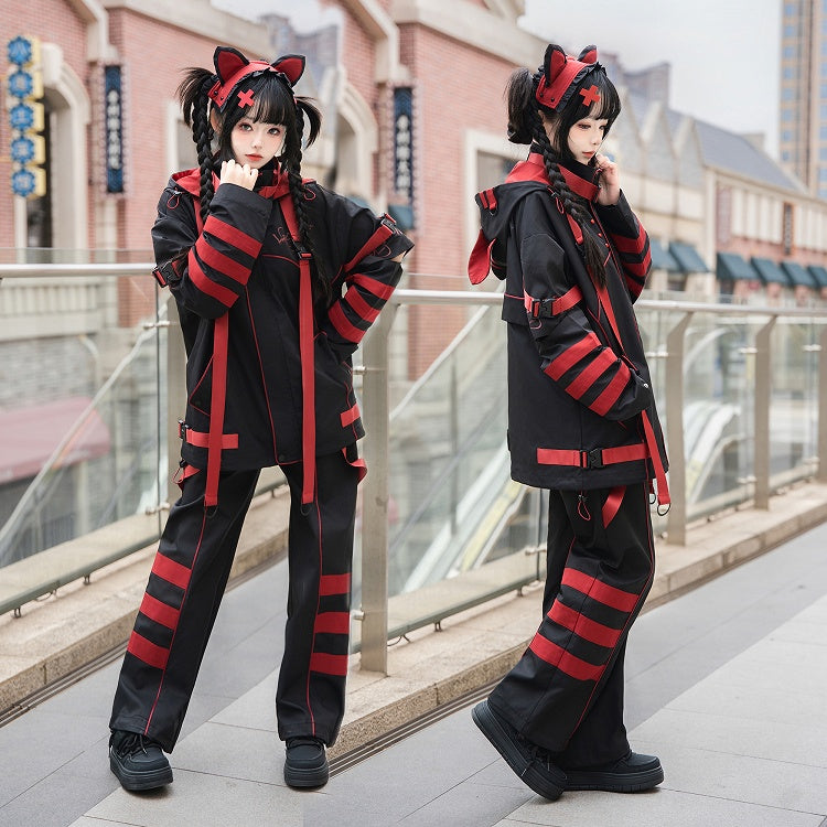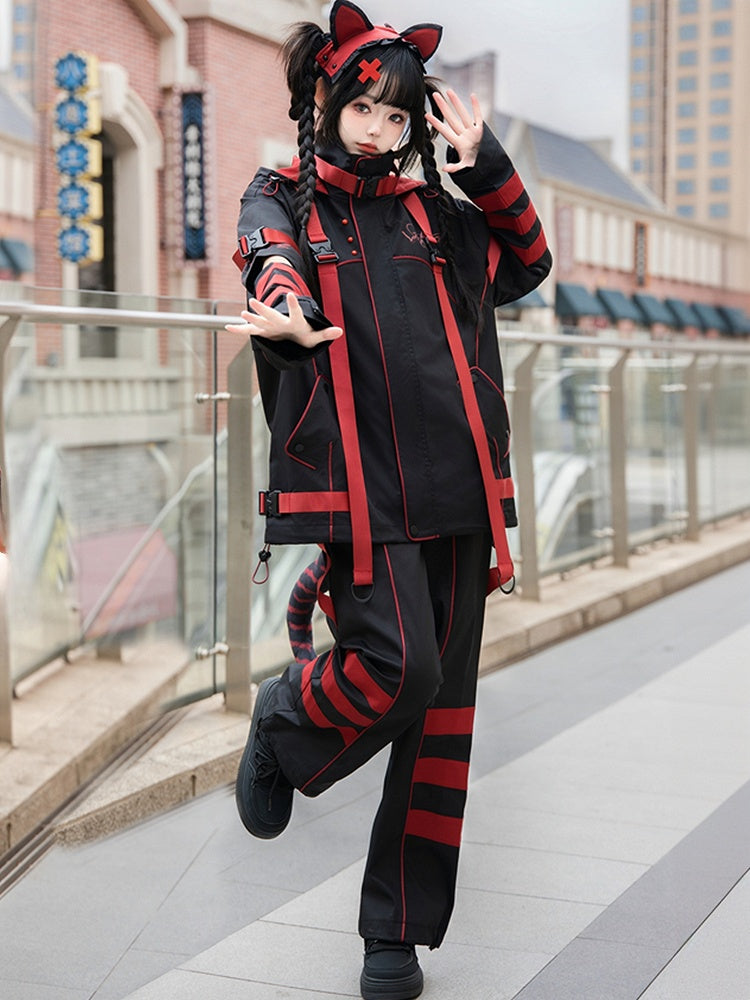 黒と赤のストライプが映える未来的なサイバーファッション衣装 - ウィンドブレーカージャケット + ショートパンツ/パンツ + レッグウォーマー フルセット
