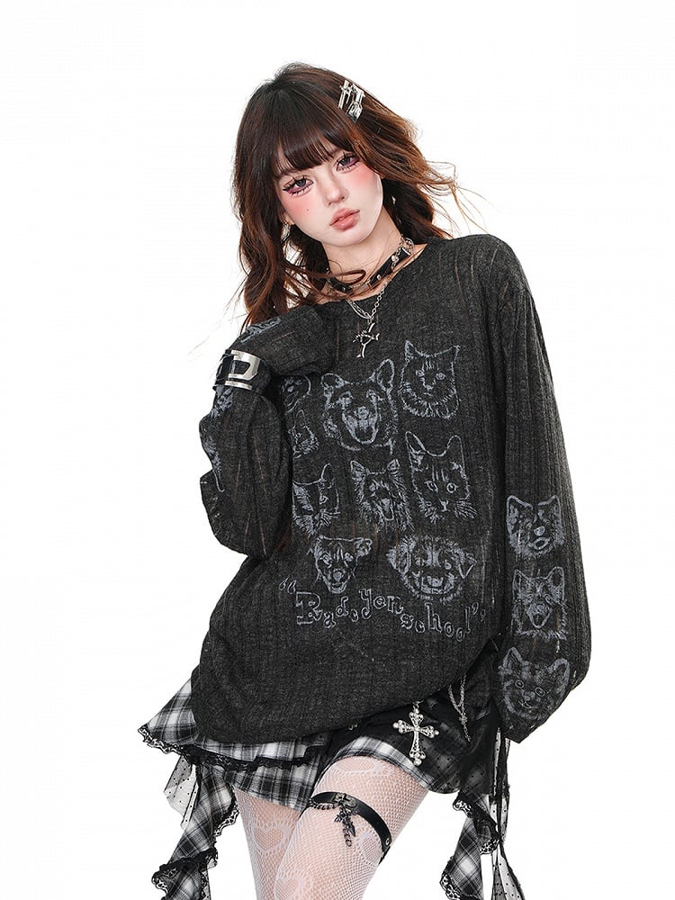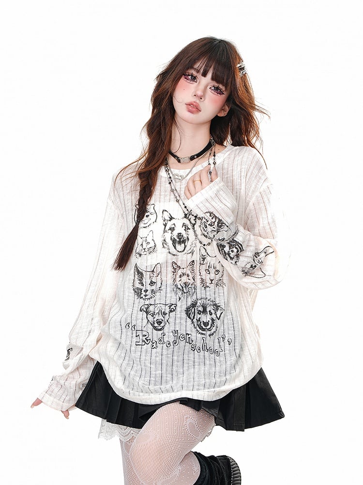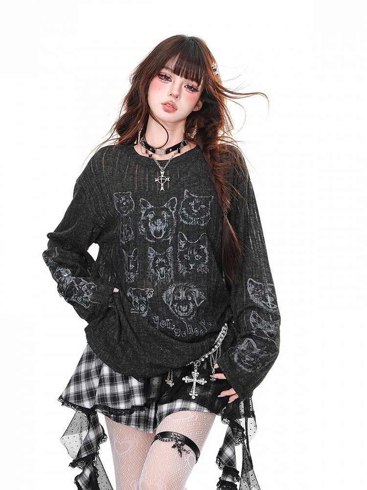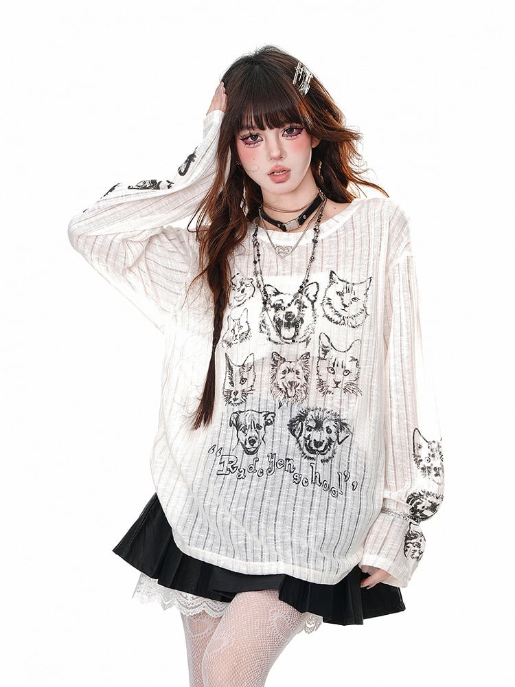 ブラック/ベージュのセミシースルーラウンドネックの子犬と子猫のゆったりトップス