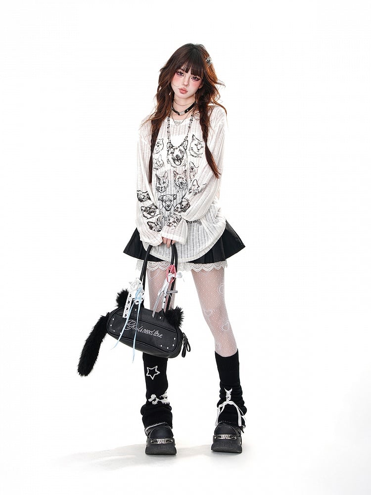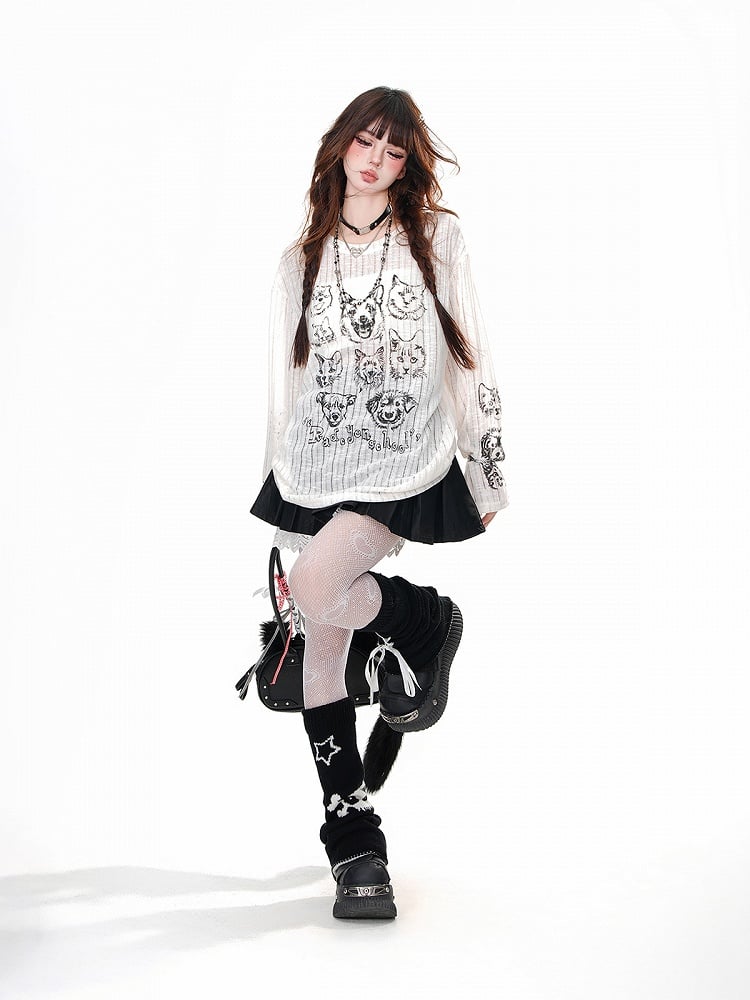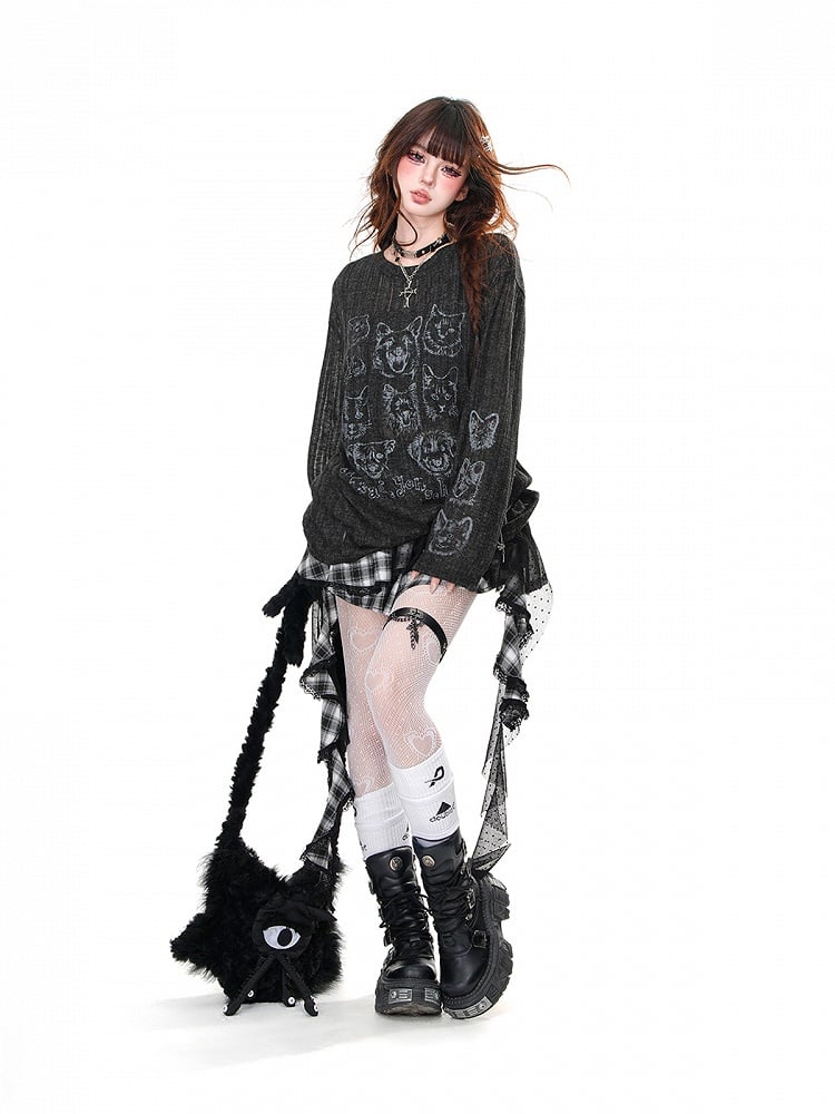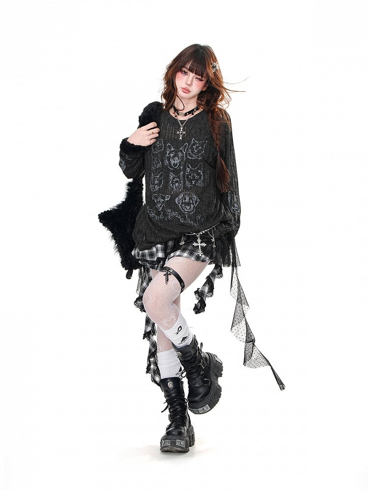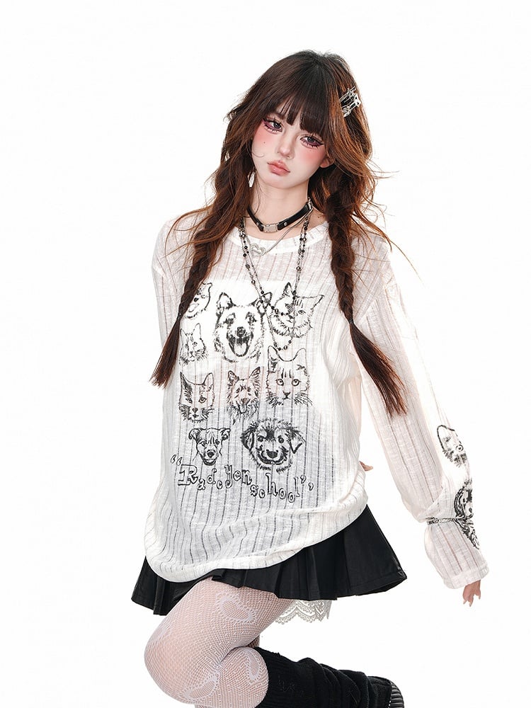 ブラック/ベージュのセミシースルーラウンドネックの子犬と子猫のゆったりトップス