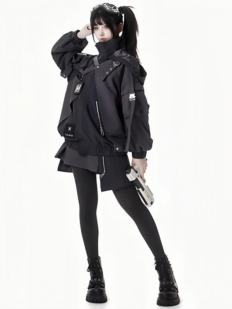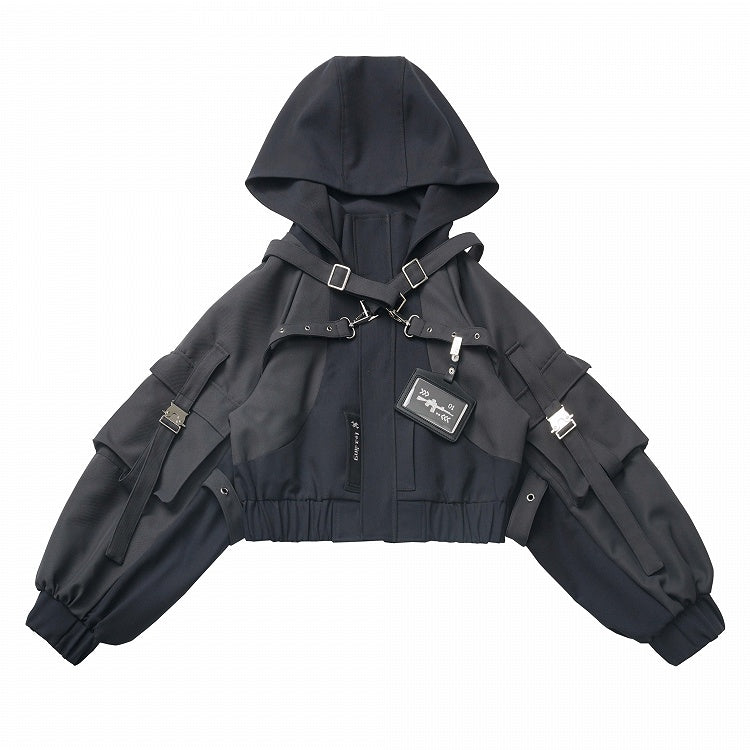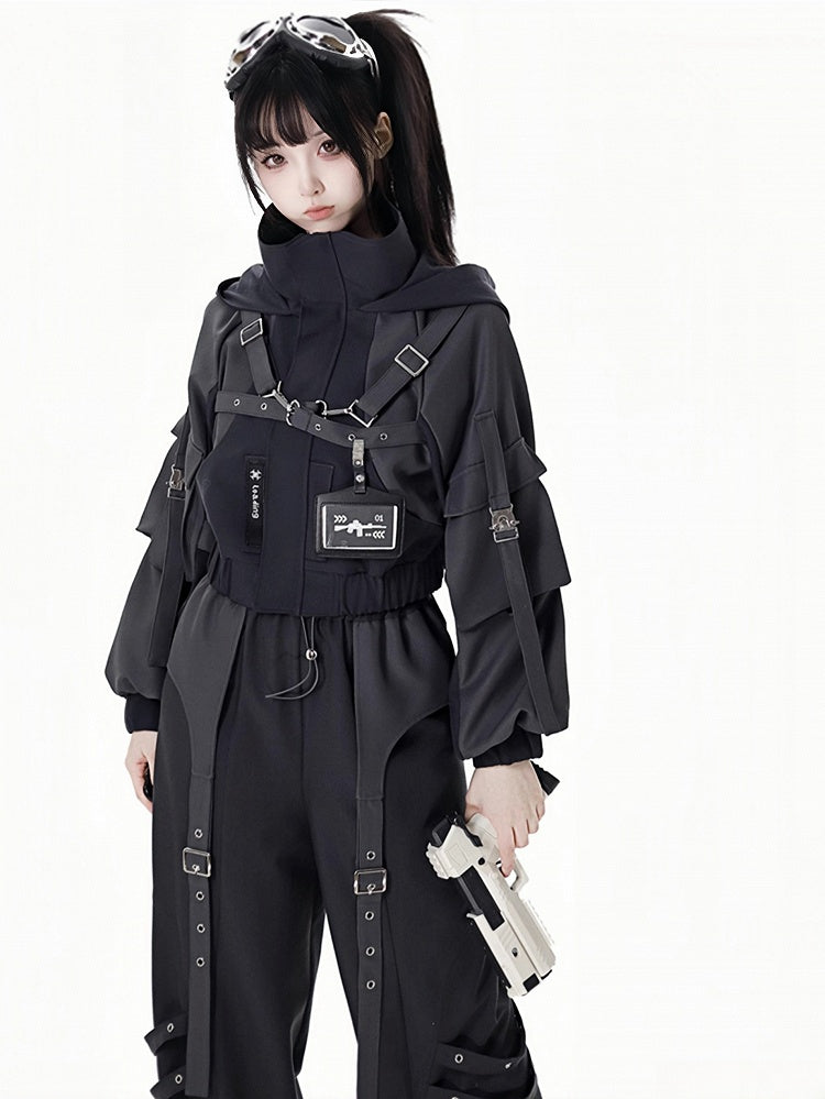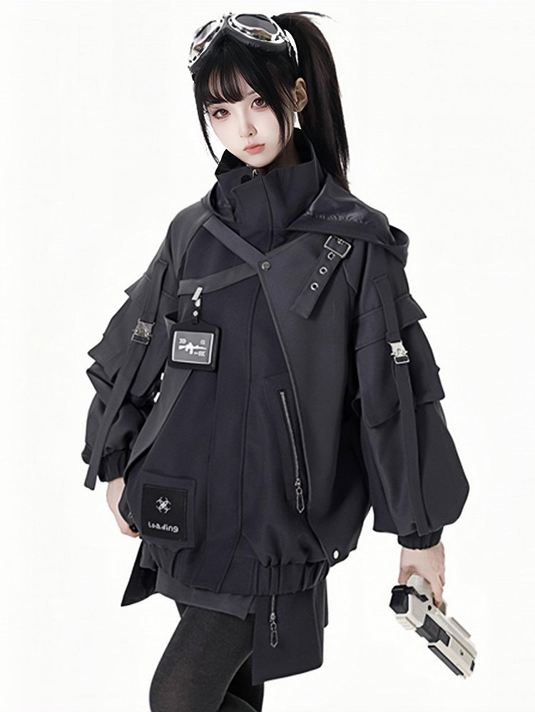 ブラックバックルストラップ、伸縮性のある袖口、ウエストフード付きジャケット、ショート/ロングバージョン