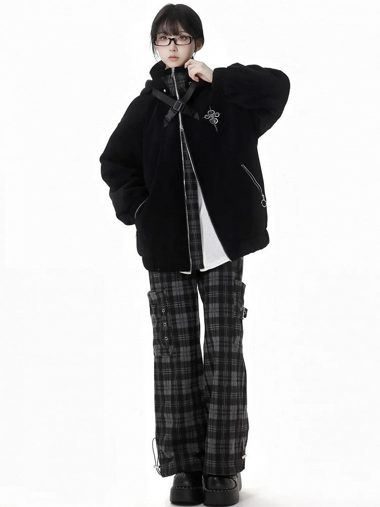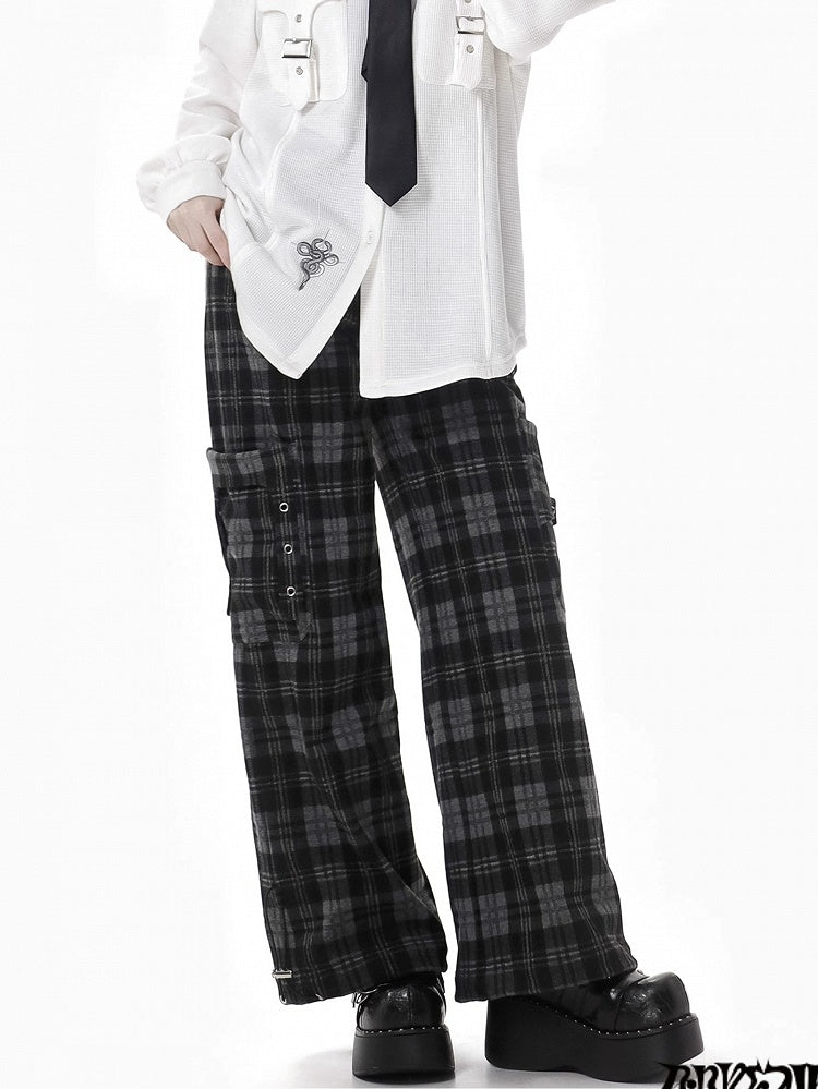 実用性とスタイルを兼ね備えたブラックのカーゴポケットチェックパンツ。丈夫な素材と複数のポケットが利便性と耐久性を高め、チェック柄がコーディネートに可愛らしさをプラスします。どんなシーンにもぴったりです。
