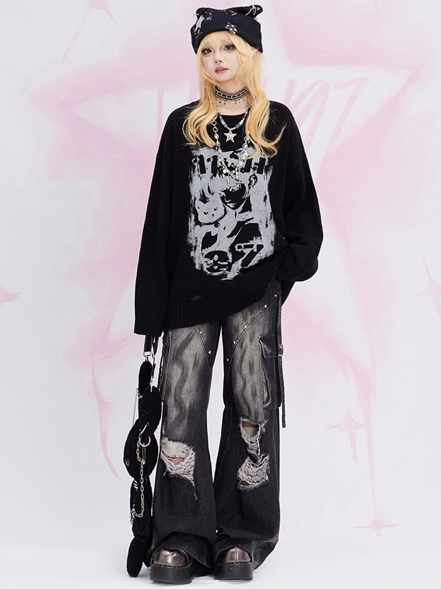 ダメージ加工のトリムとキュートな黒猫柄が特徴の、愛らしいセーター。ゆったりとしたトップスで、心地よくスタイリッシュに過ごしましょう!