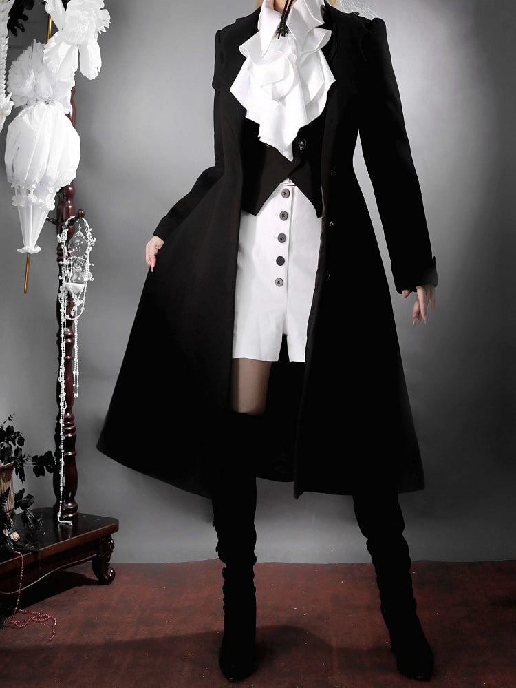 この愛らしい黒のカーブしたコウモリの羽根模様の襟が特徴的なゴシックロリータコートは、ワードローブに個性的なスタイルをプラスするのに最適です。カーブしたコウモリの羽根模様の襟とゴシックロリータデザインで、どんな人混みの中でもひときわ目を引くこと間違いなし。このマストハブコートで、暖かくスタイリッシュに過ごしましょう!