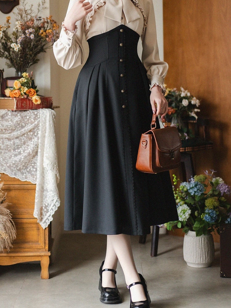 ブラックのエレガントなヴィンテージボーン入りハイウエストミディ丈ストライプ生地ロリータスカート