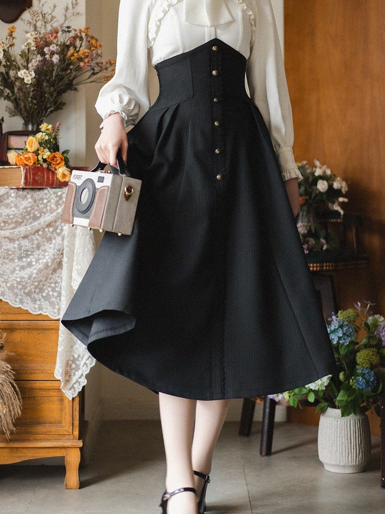 ヴィンテージ風の黒のロリータスカートは、ボーン入りのエレガントなハイウエストデザインで、体にぴったりフィットします。ミディ丈とストライプ柄が洗練された雰囲気を添えます。ワードローブに素敵な一着を加えて、あなたの内なるキュートさを引き出しましょう。