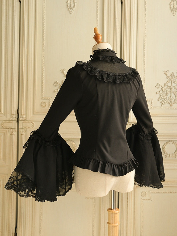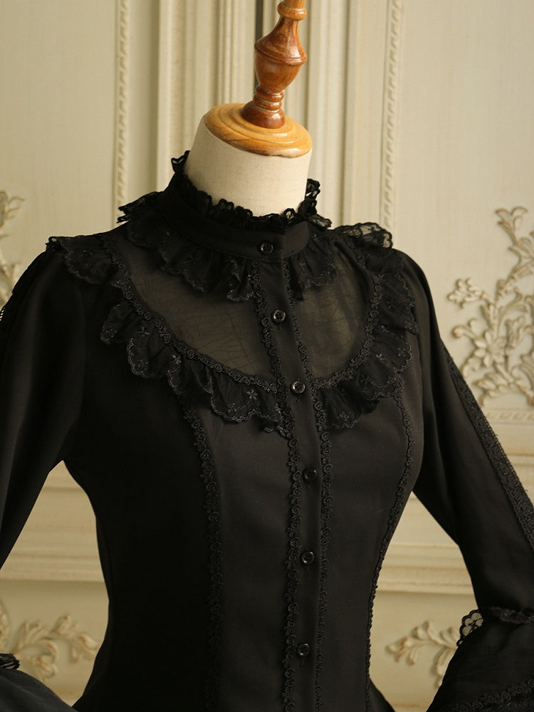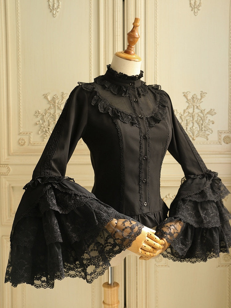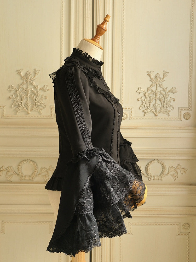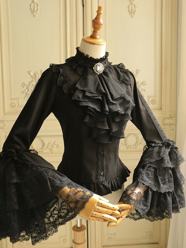 ブラック ジャボタイ フリルネックライン ロングベルスリーブ ブラウス