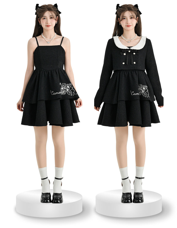 ブラックジャケットドレス フレグランスカラーサスペンダー グリッターローズ+パールスーツ ショートパンツ