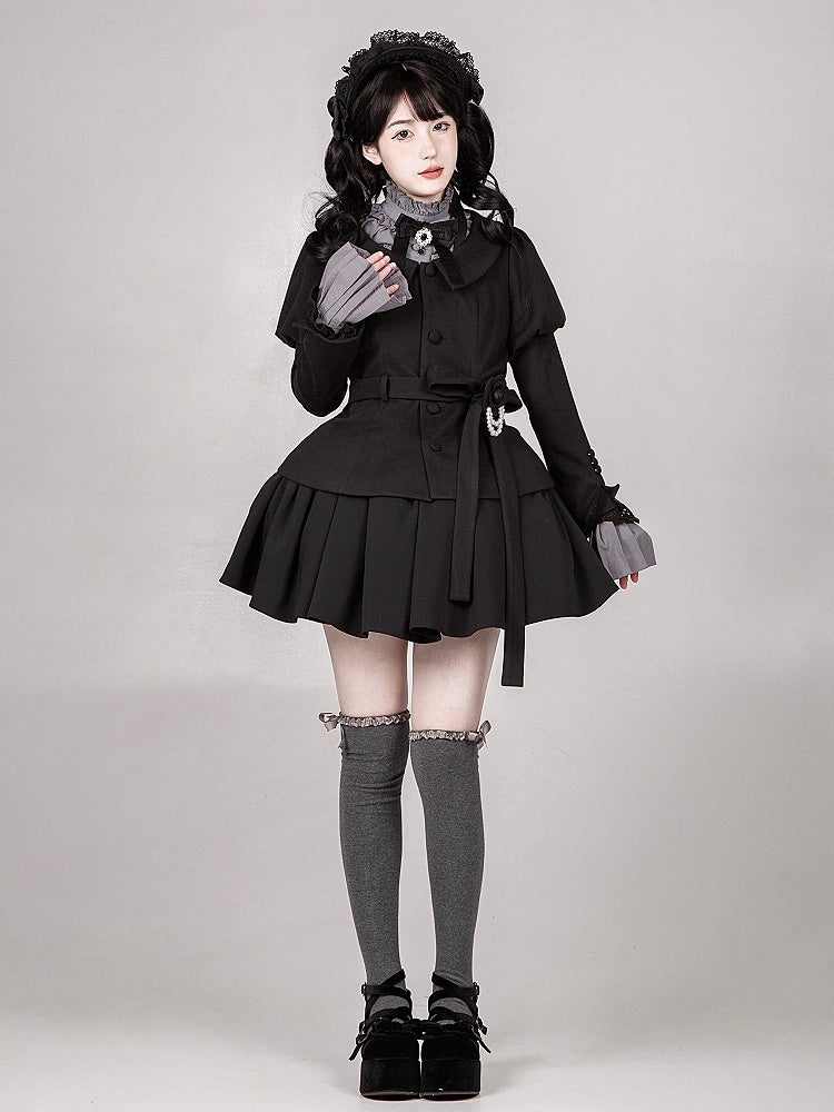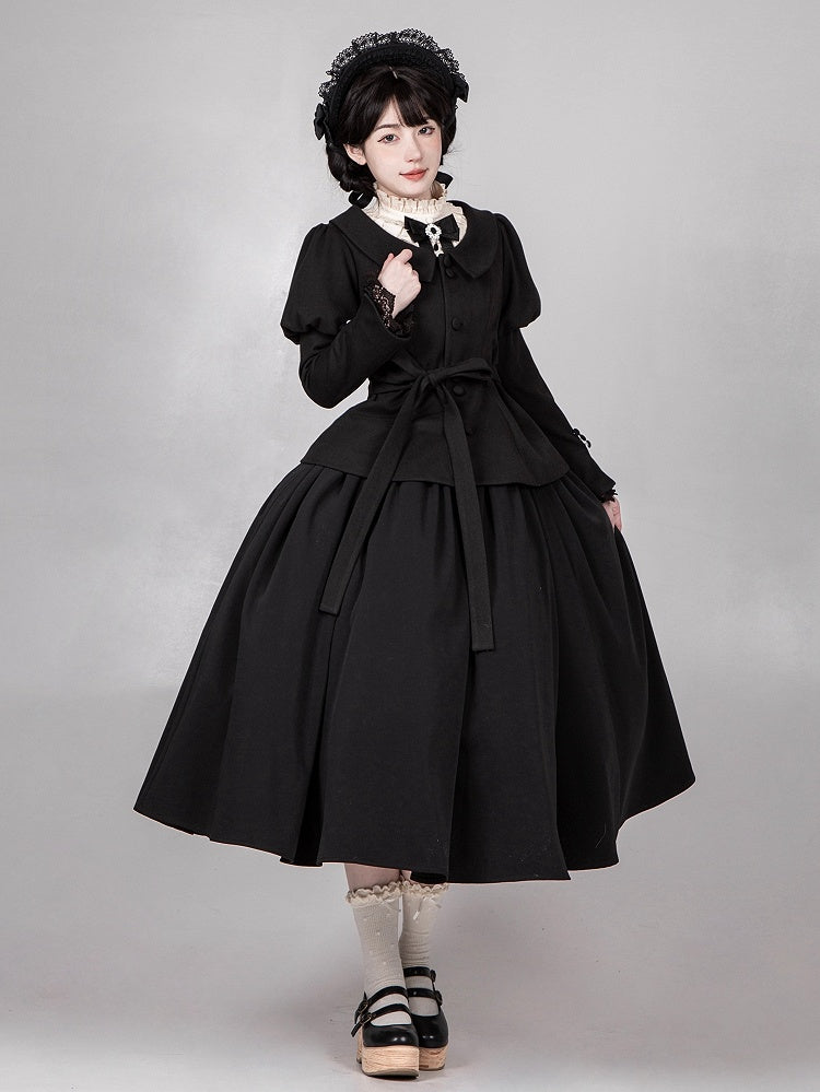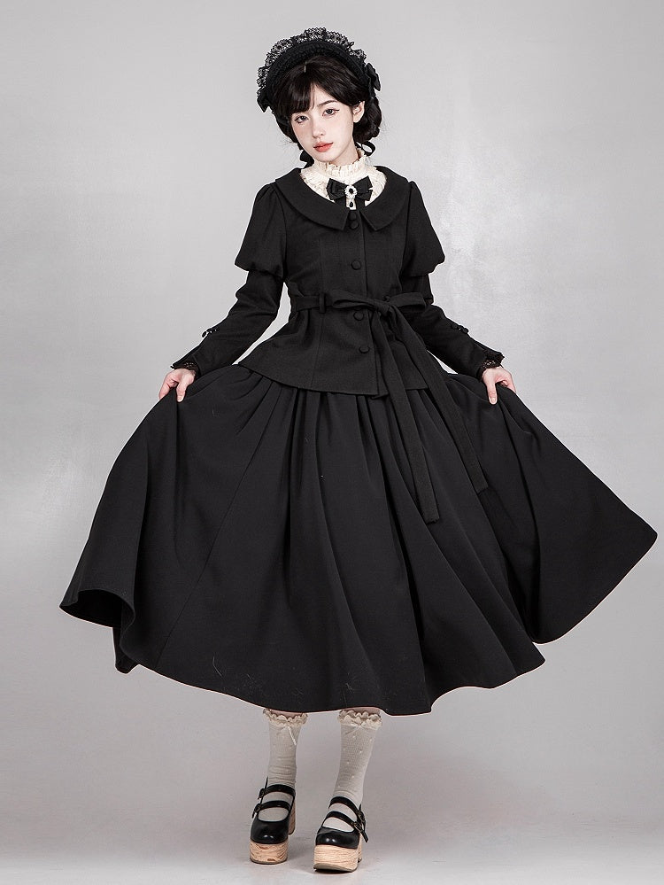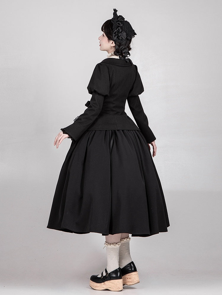 ブラック ジュリエットスリーブ ラウンドフラットカラー ロングスリーブコート