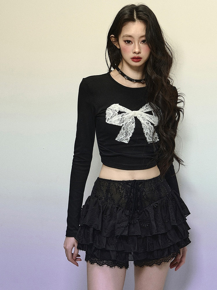 ブラックレースの花柄ハイウエストティアードミニスカートレースアップディテール