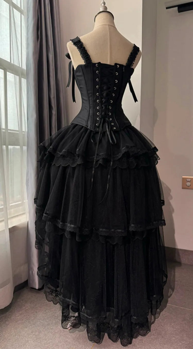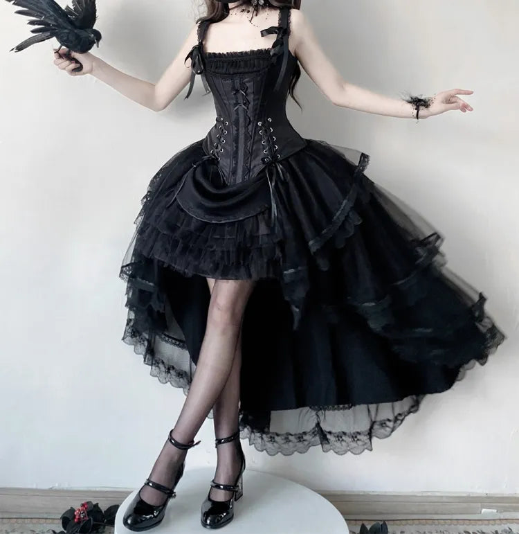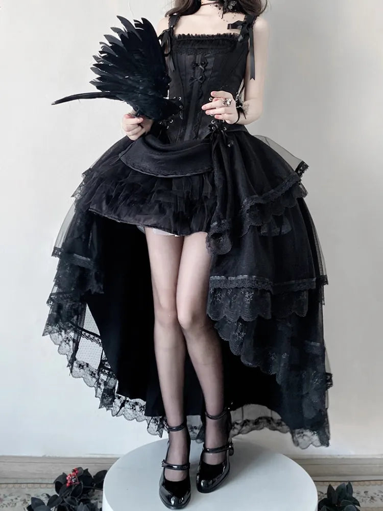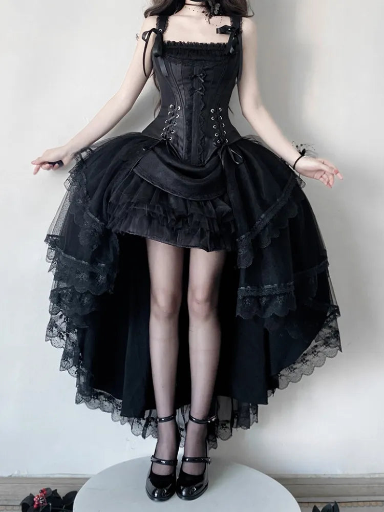 ブラックのレースアップディテールのボーン入りコルセットトップ + ハイローレイヤードロリータスカート