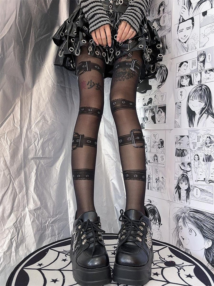 ブラック/ヌードカラーのバックルストラッププリントパンクタイツ