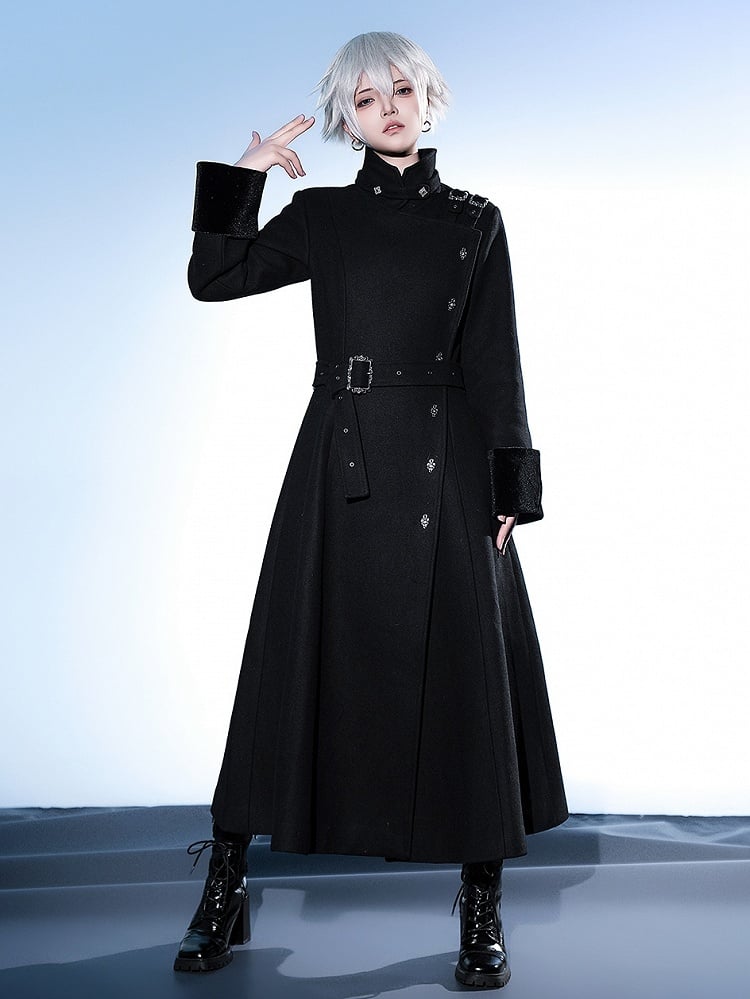 スタンドカラーとハイネックが特徴の、愛らしいブラック王子ロリータコート。寒い季節の暖かさとスタイリッシュさを両立。上質なウール素材を使用し、着心地の良さと耐久性を兼ね備えています。キュートで温かみのある装いを演出する、ワードローブに欠かせないアイテムです。