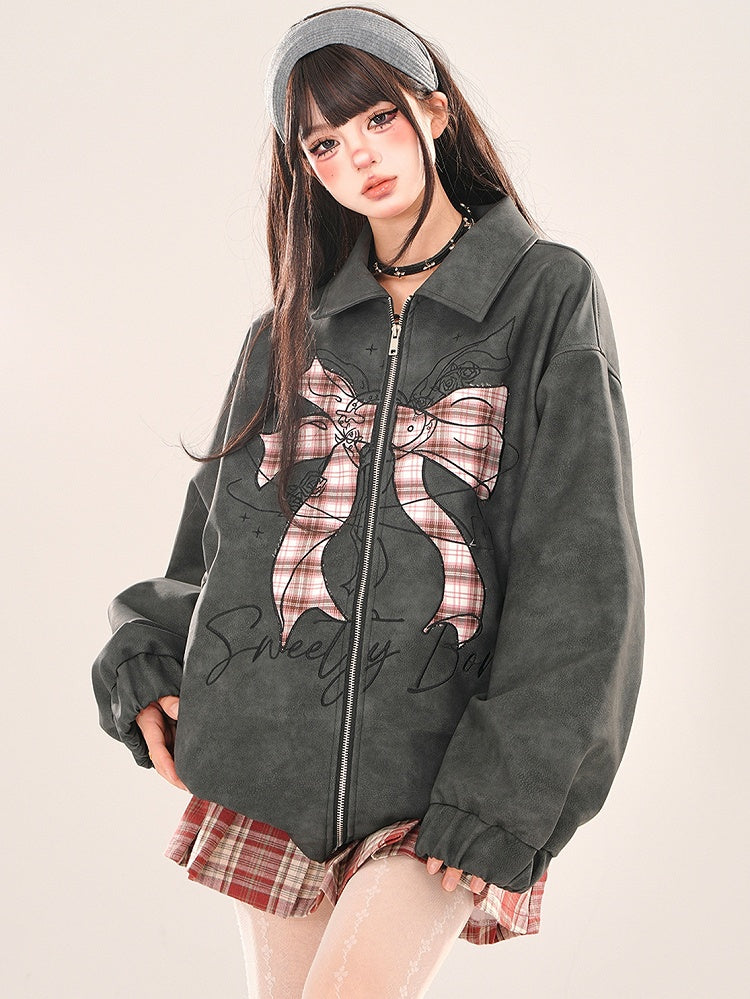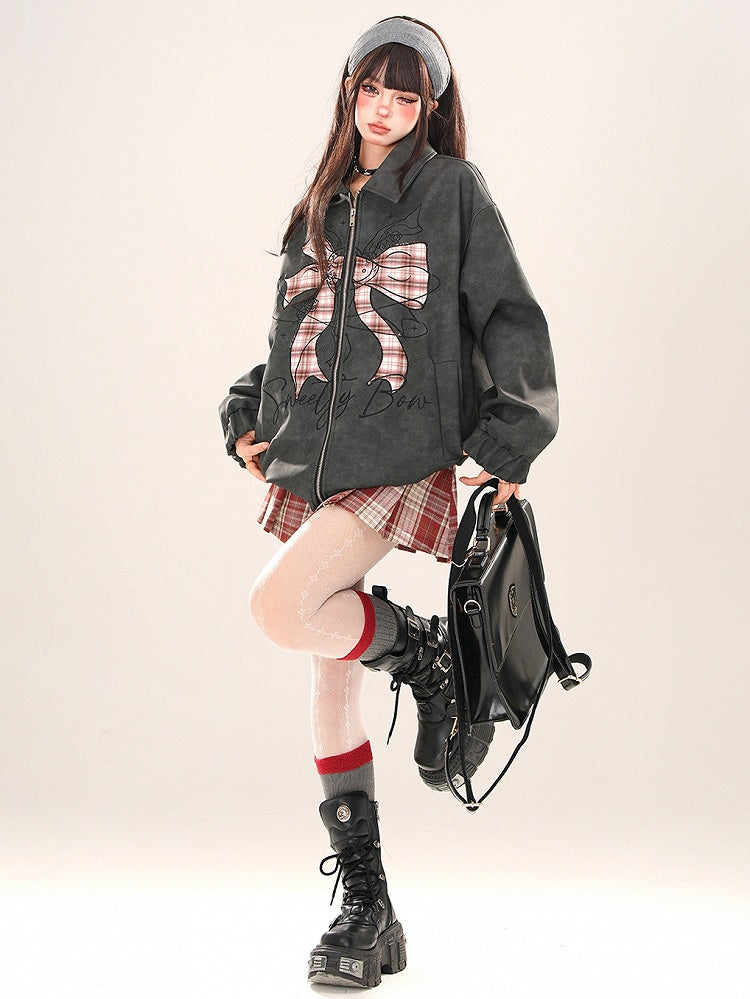 ブラックチェック柄 蝶結び ジッププラケットジャケット