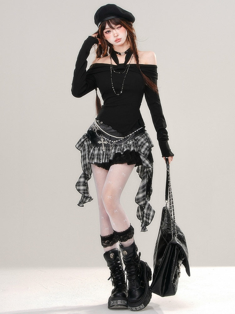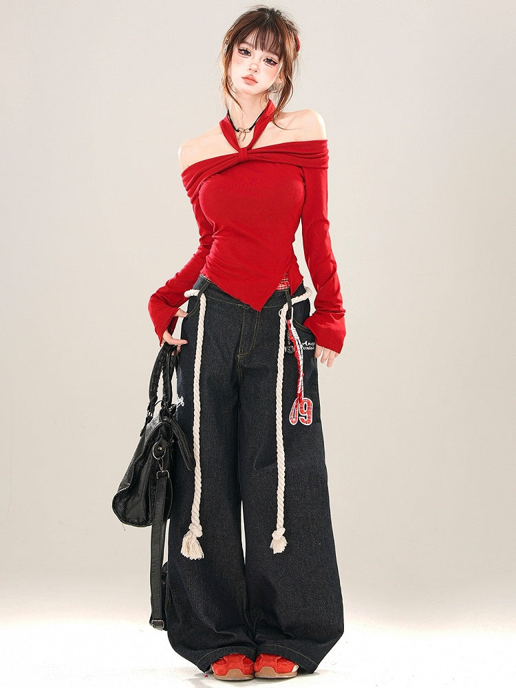 魅力的なブラック/レッドのアシンメトリースリットヘムホルターネックトップス。目を引くデザインと、肩を美しく見せるホルターネックが魅力です。夜のお出かけにも、ビーチでの一日にもぴったりです。