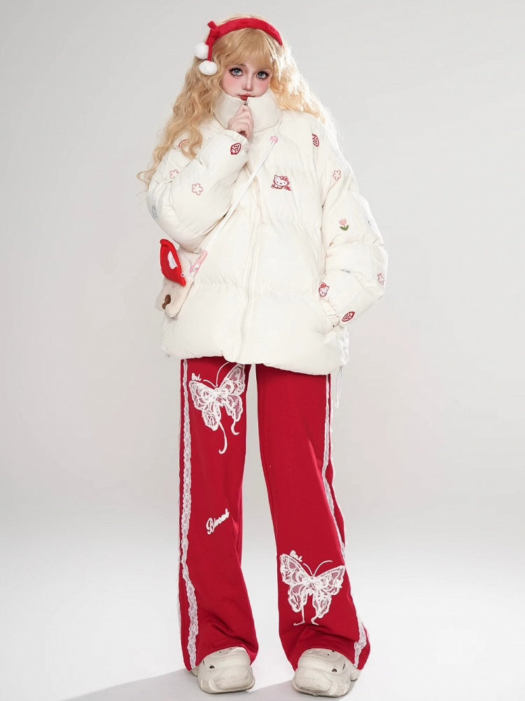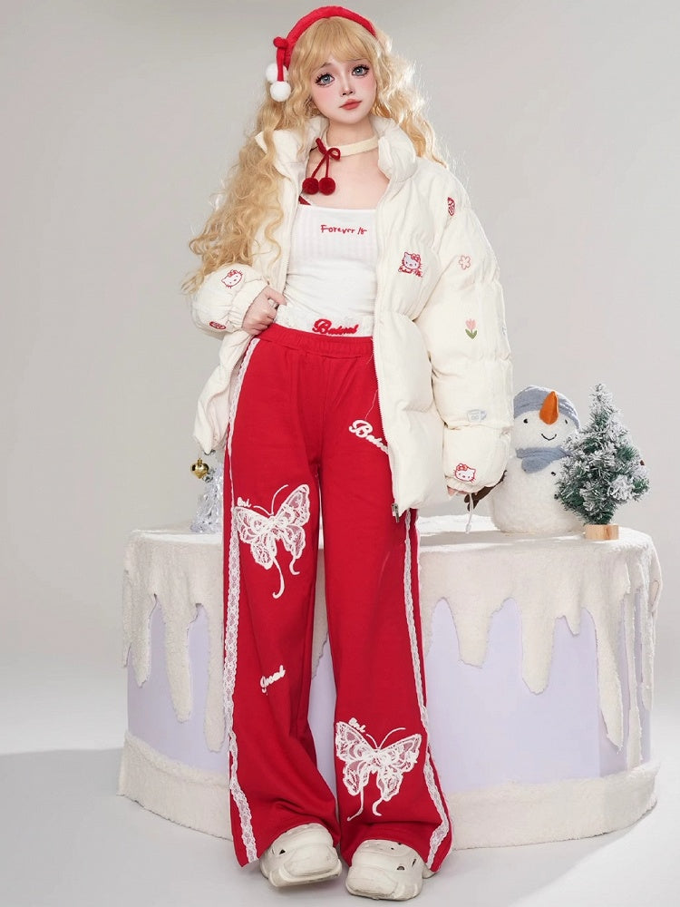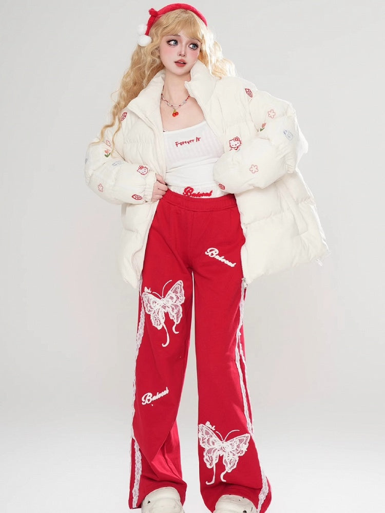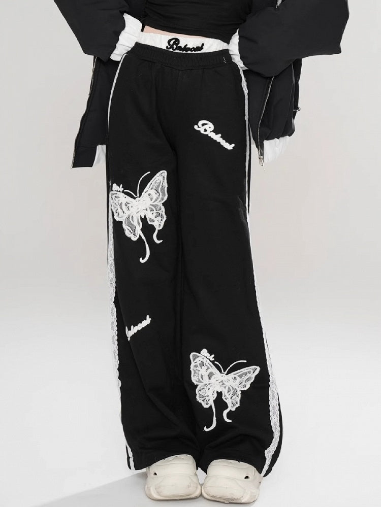 ブラック/レッド レース バタフライ ストレート レッグ カット パンツ レーストリム
