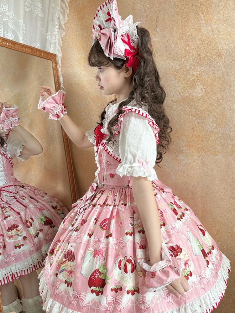 ピンクと白のオールドスクールロリータファッションドレス、蝶結びディテール、ロリータJSKセット