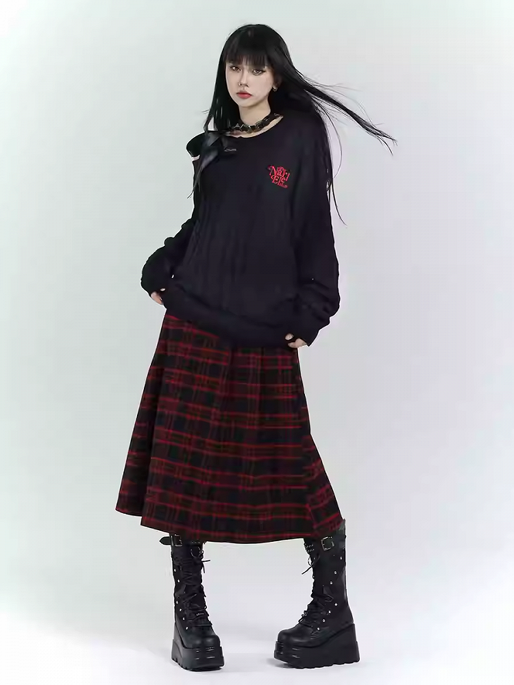 ブラック&レッドのチェック柄ダブルバックルミディ丈スカート