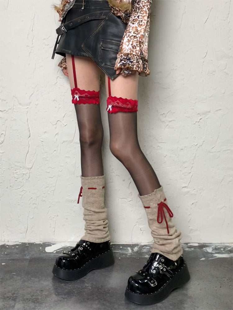 ブラックレッドY2Kリボンレースサスペンダータイツ