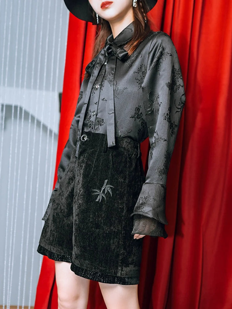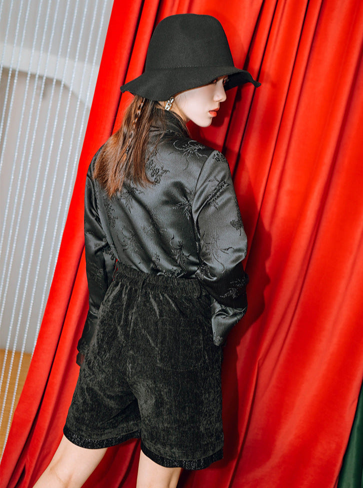 繊細な刺繍が施されたこのブラックのショートパンツは、最高級のチャイナベルベットを使用し、愛らしくも高級感のある仕上がりです。どんなワードローブにも合わせやすい、キュートでスタイリッシュなアイテムです。
