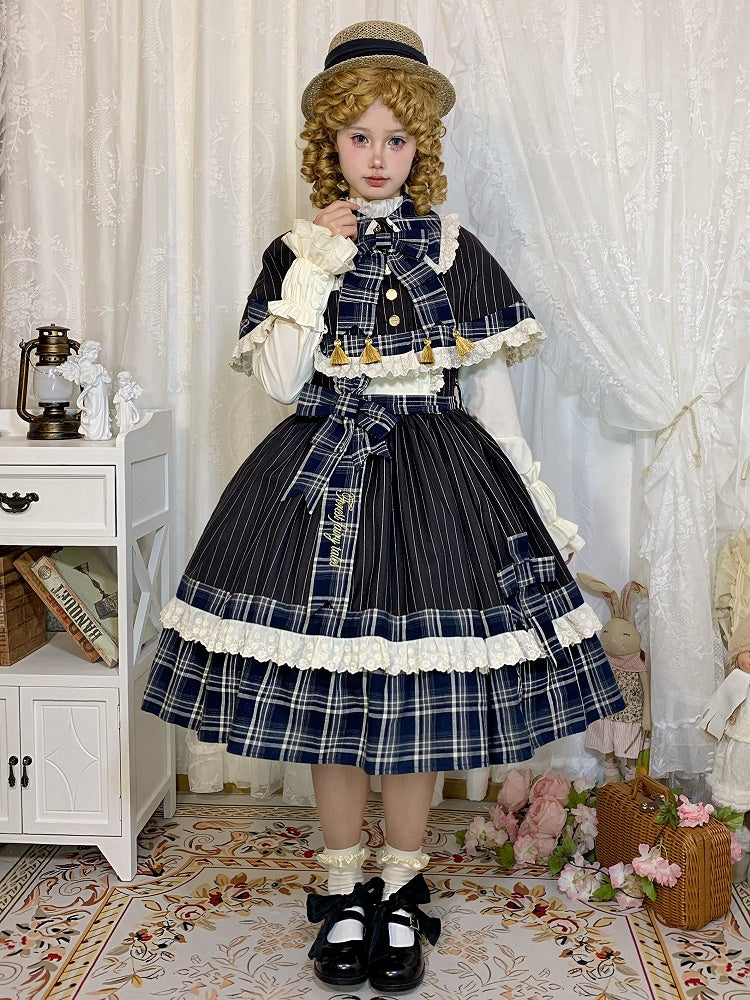 青と白のオールドスクールロリータファッションドレス 蝶結びディテール JSK セット