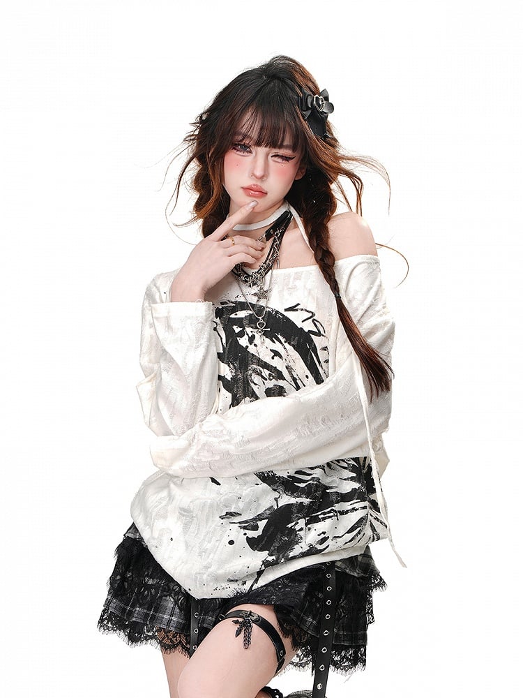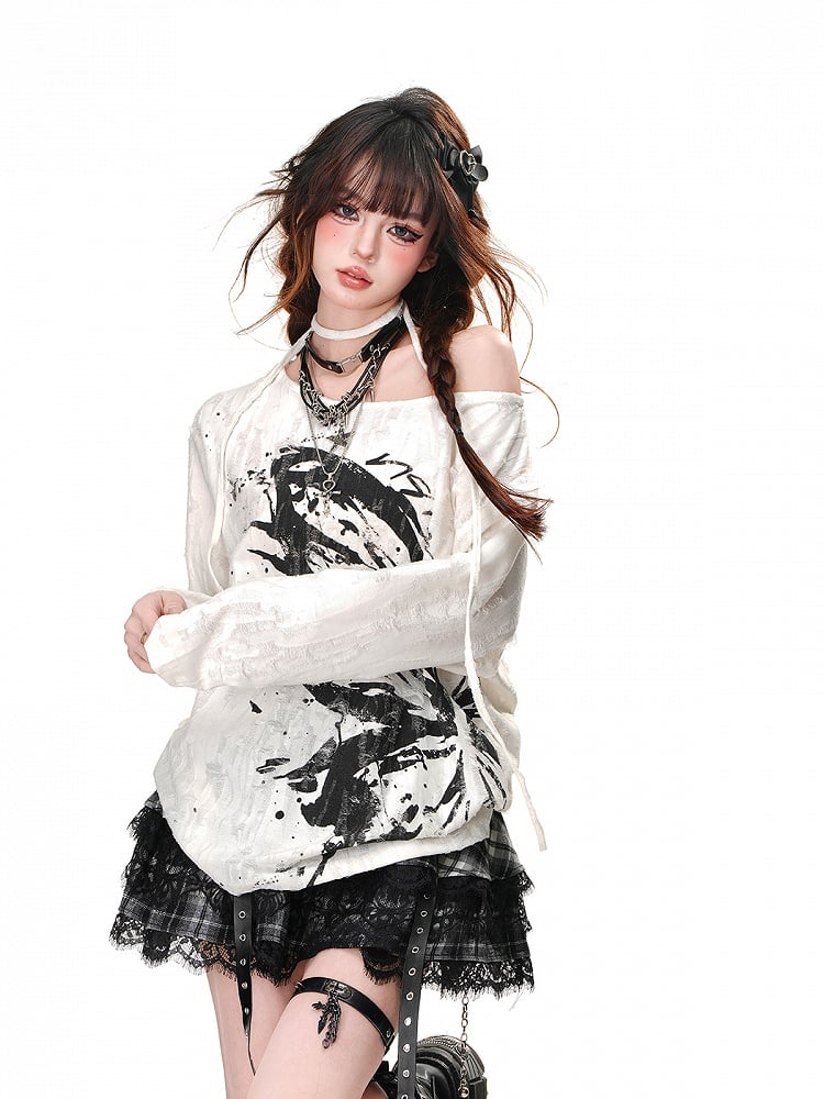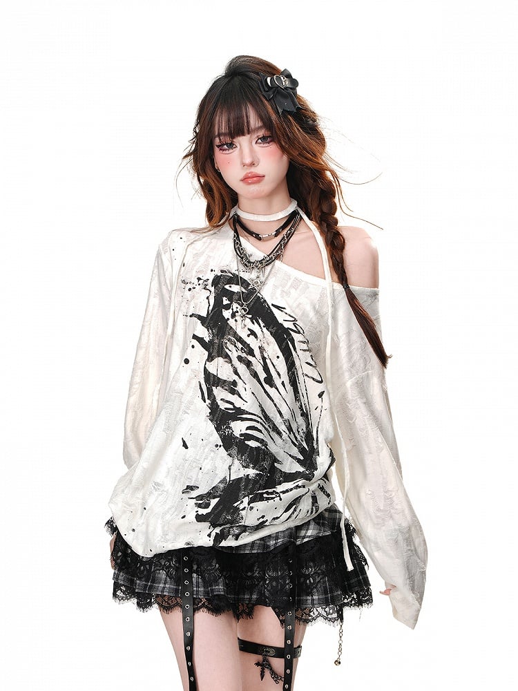ブラック/ホワイトのアシンメトリーネックライン、ダメージ加工の穴あきバタフライルーズトップス