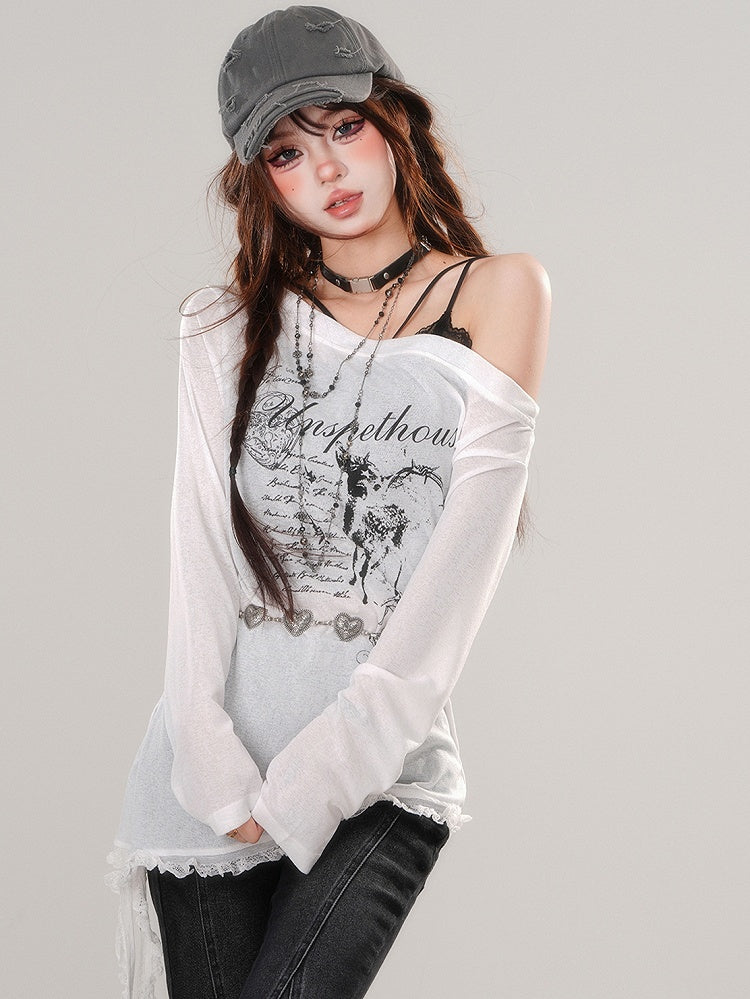 この愛らしいトップスは、ユニークなアシンメトリーのネックライン、スタイルアップ効果のあるサイドスリット、そしてエレガントな雰囲気を添えるレースの裾が特徴です。ワードローブに遊び心のあるエッジをプラスするのに最適です。