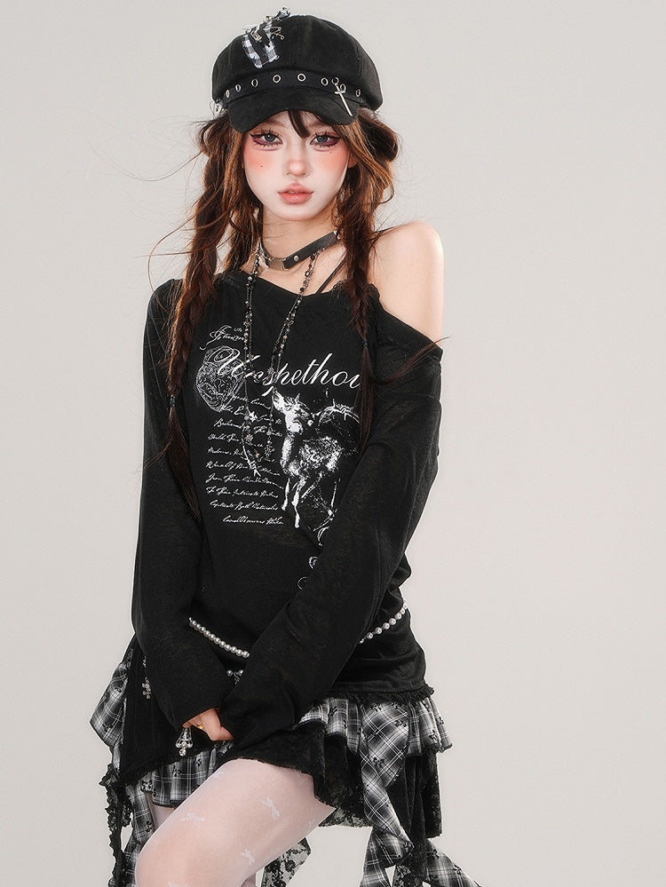 ブラック/ホワイトのアシンメトリーネックライン、サイドスリット、グラフィックトップ、レースヘム