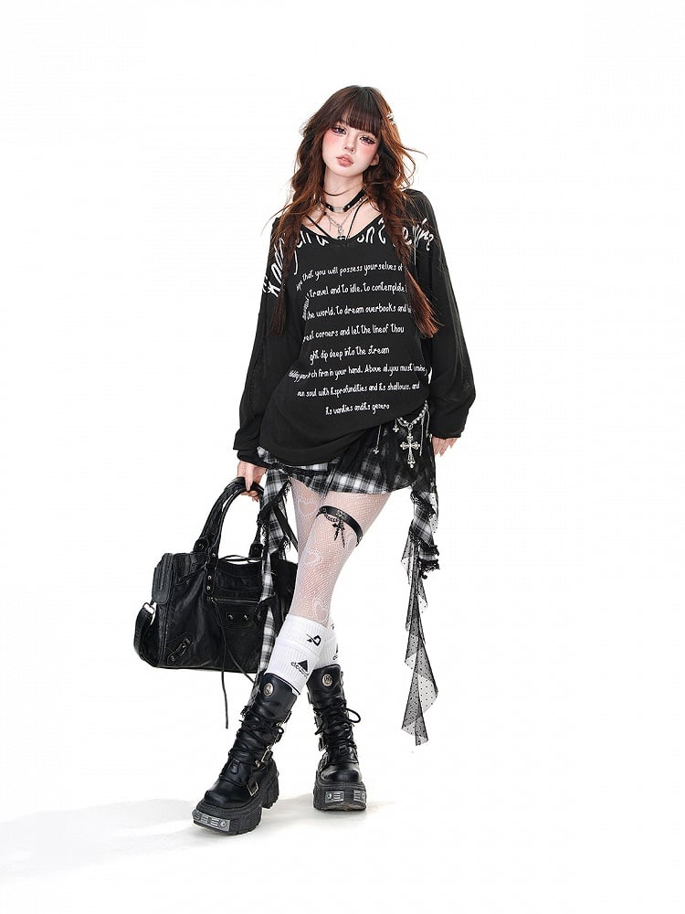 ブラック/ホワイト/ブルー セミシアー Vネック レター ルーズ パーカー