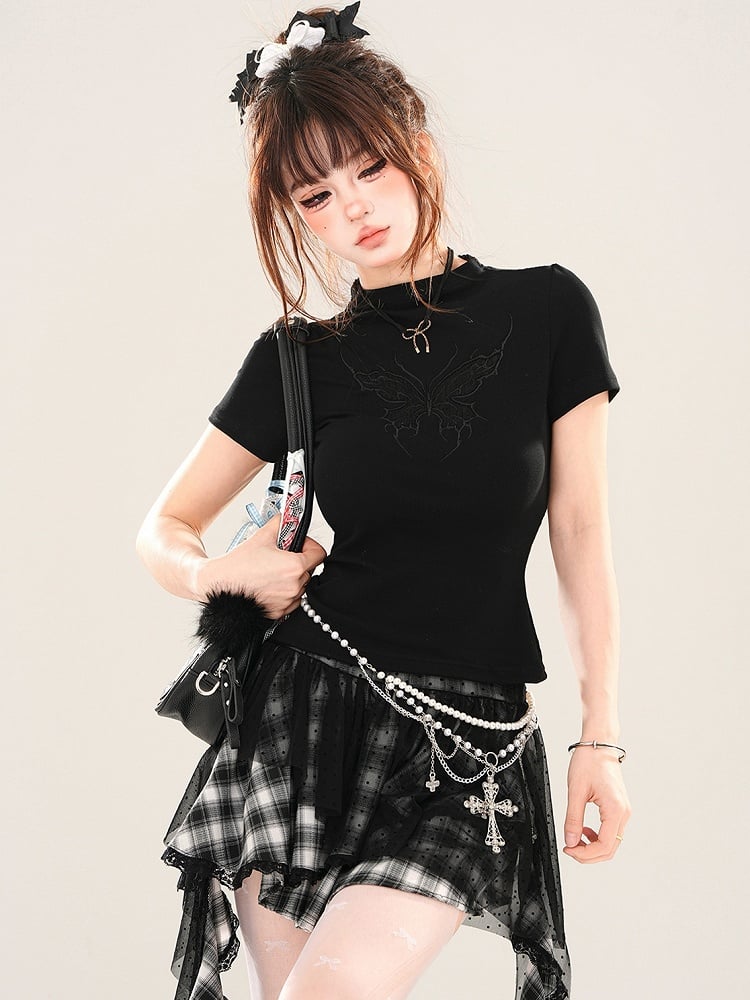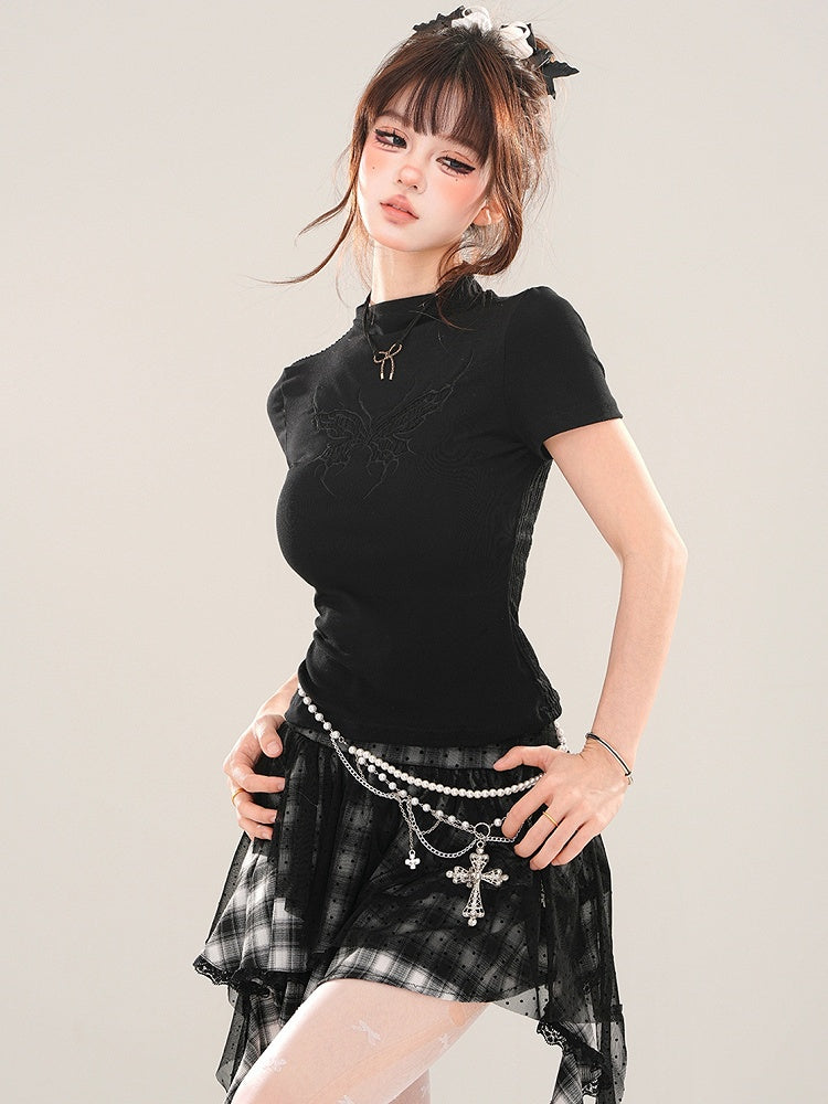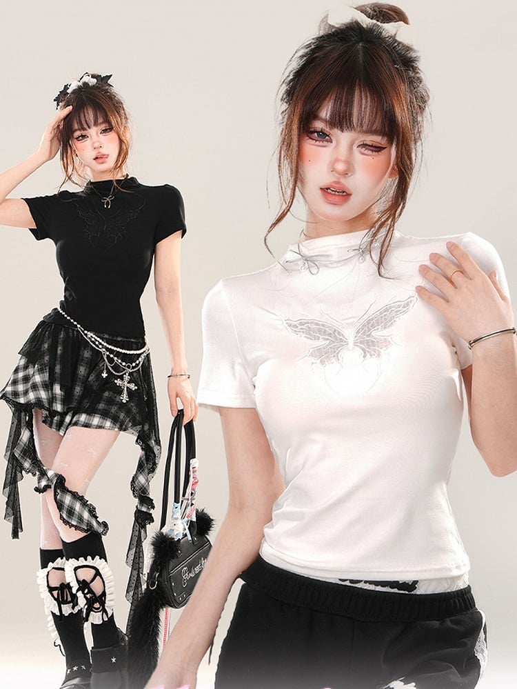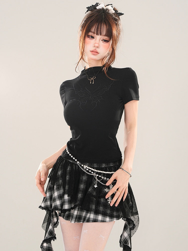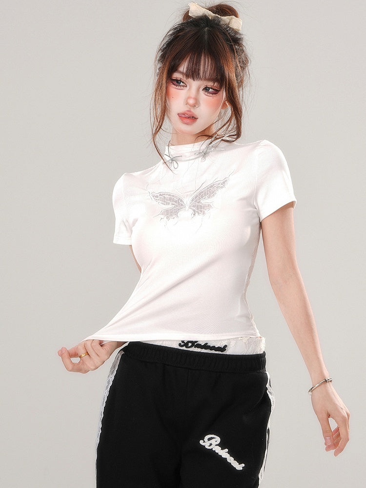 ブラック/ホワイト バタフライ モックネック Tシャツ 背中にレースパッチワーク