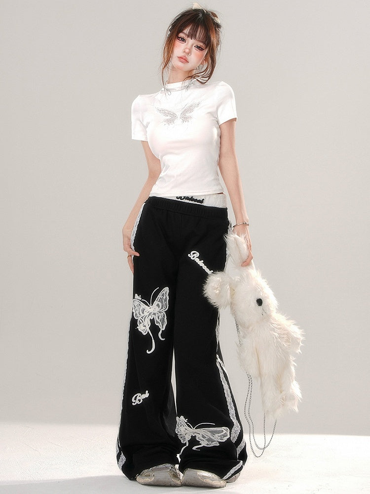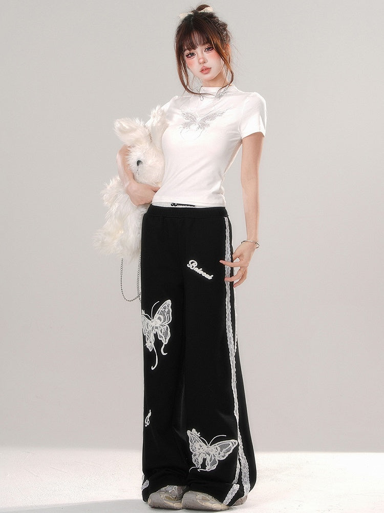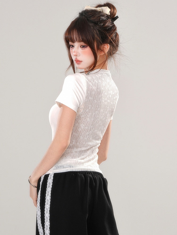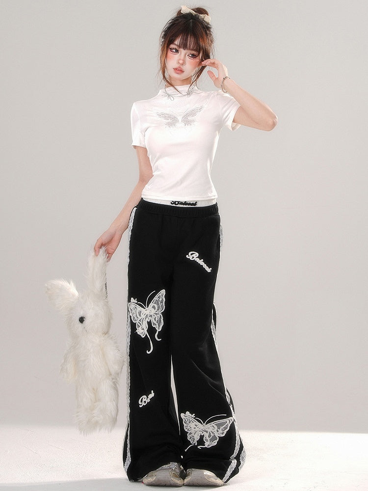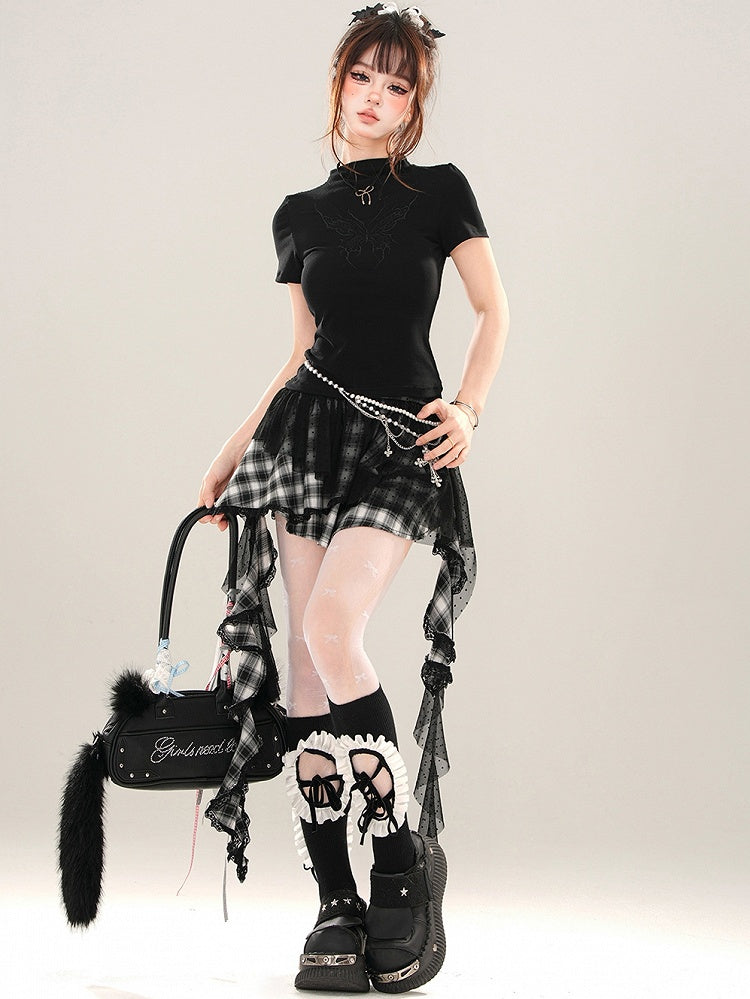 ブラック/ホワイト バタフライ モックネック Tシャツ 背中にレースパッチワーク