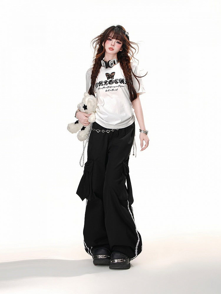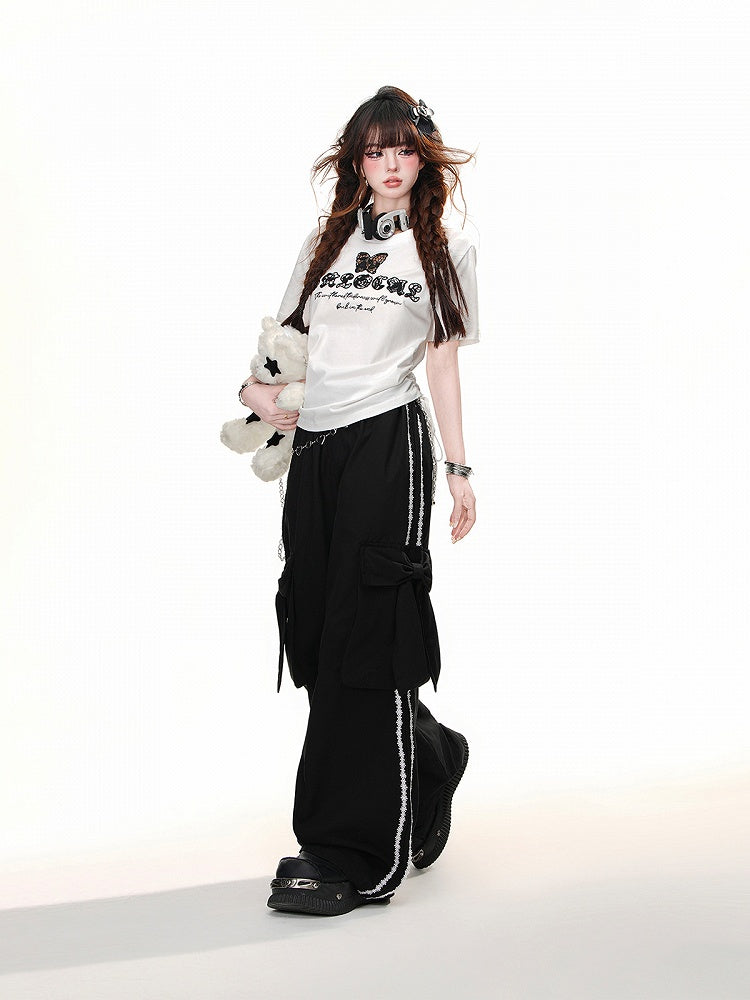 ブラック/ホワイトのバタフライシェイプカットアウトディテール、ドローストリングウエストのグラマラスTシャツ
