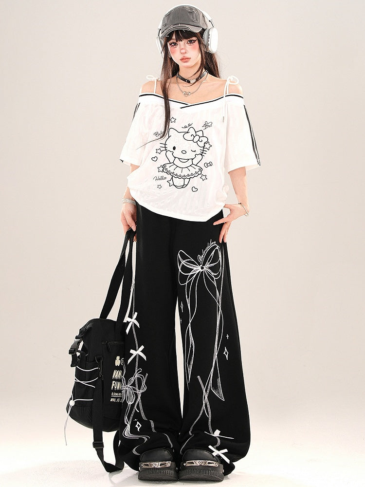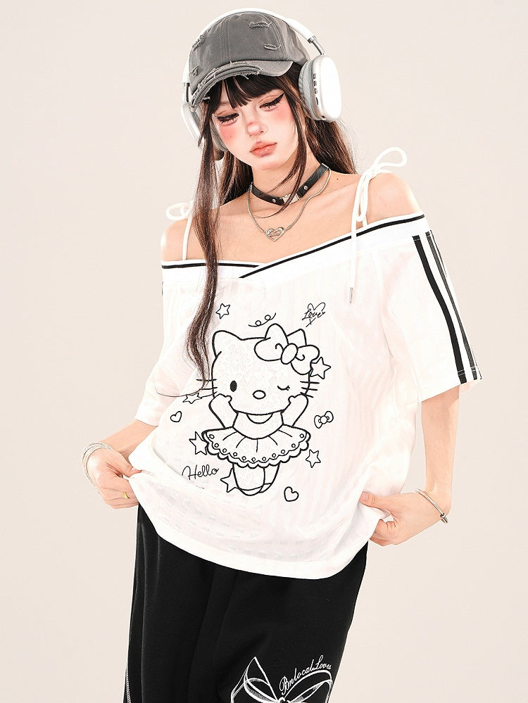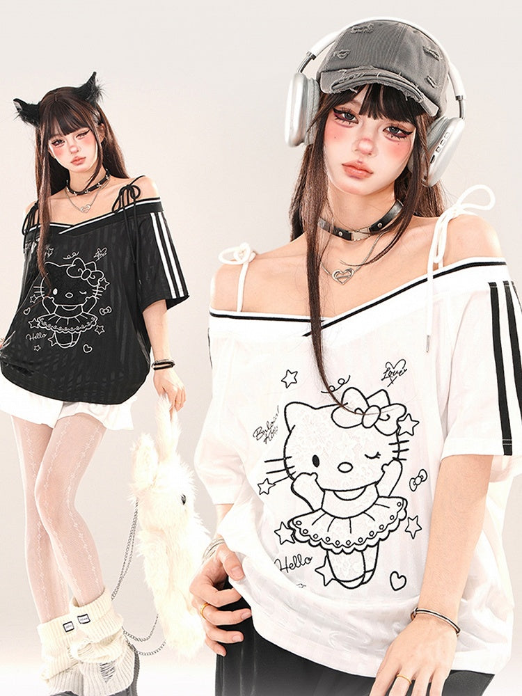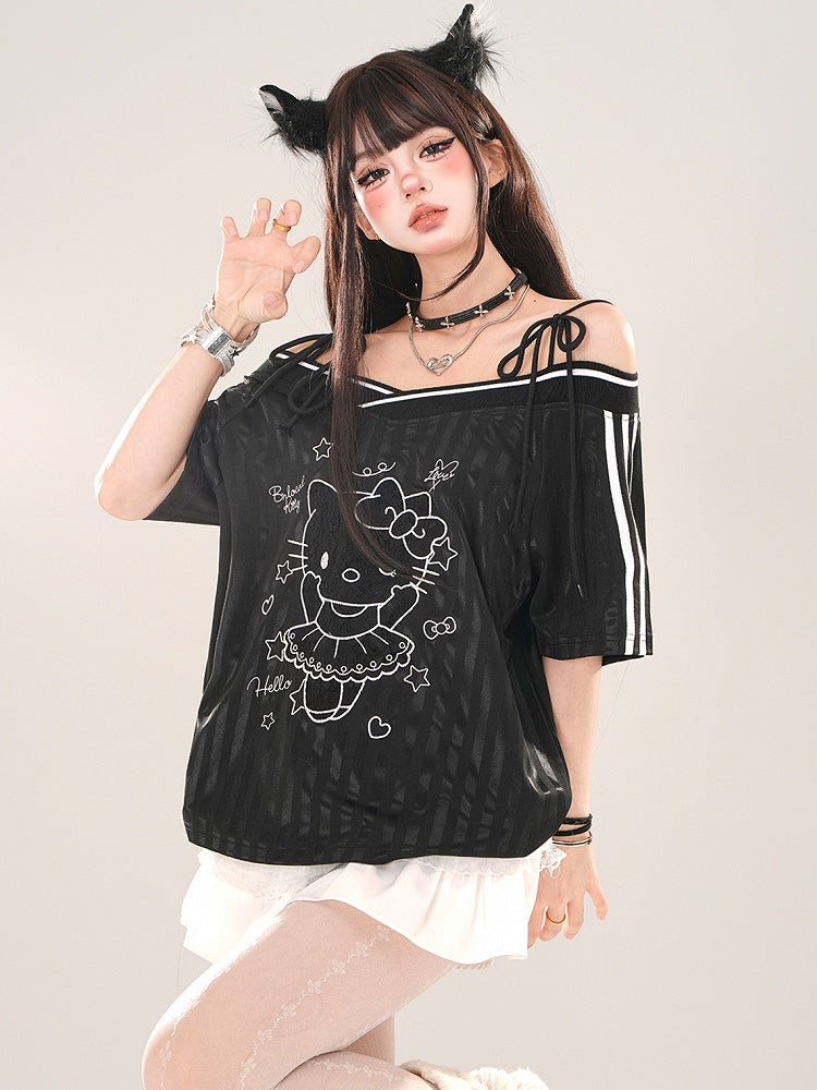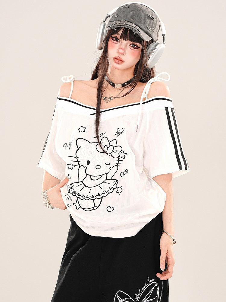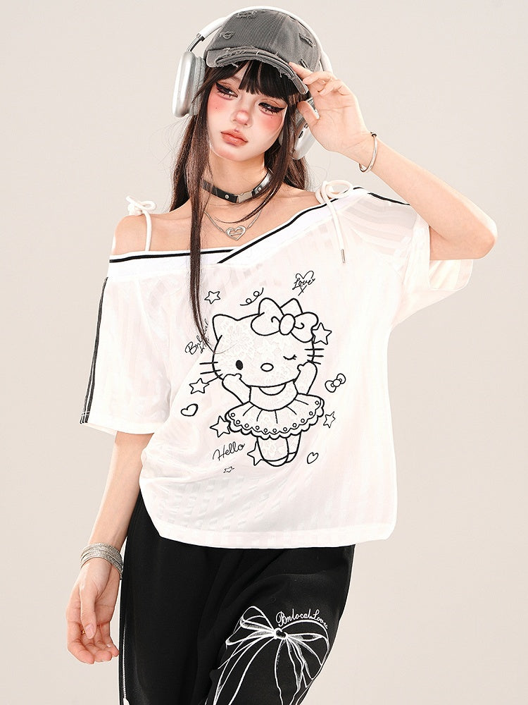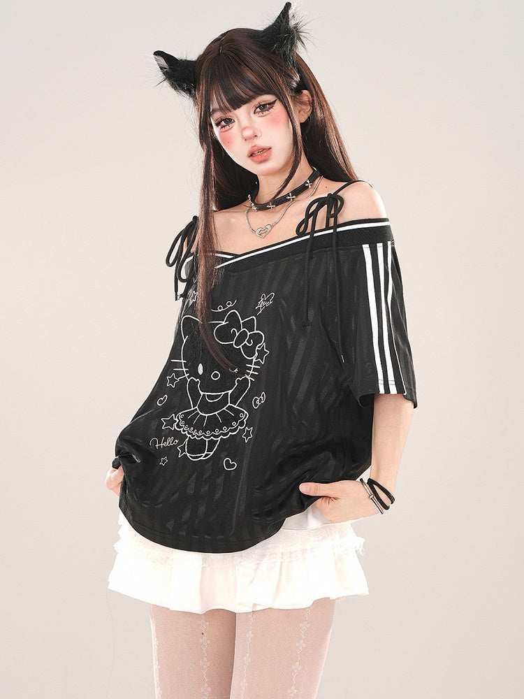 ブラック/ホワイト キティプリント オフショルダー ネックライン トップス