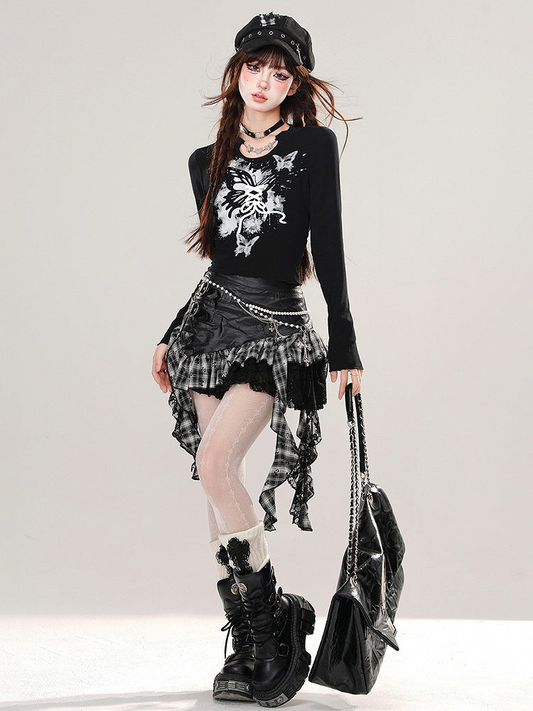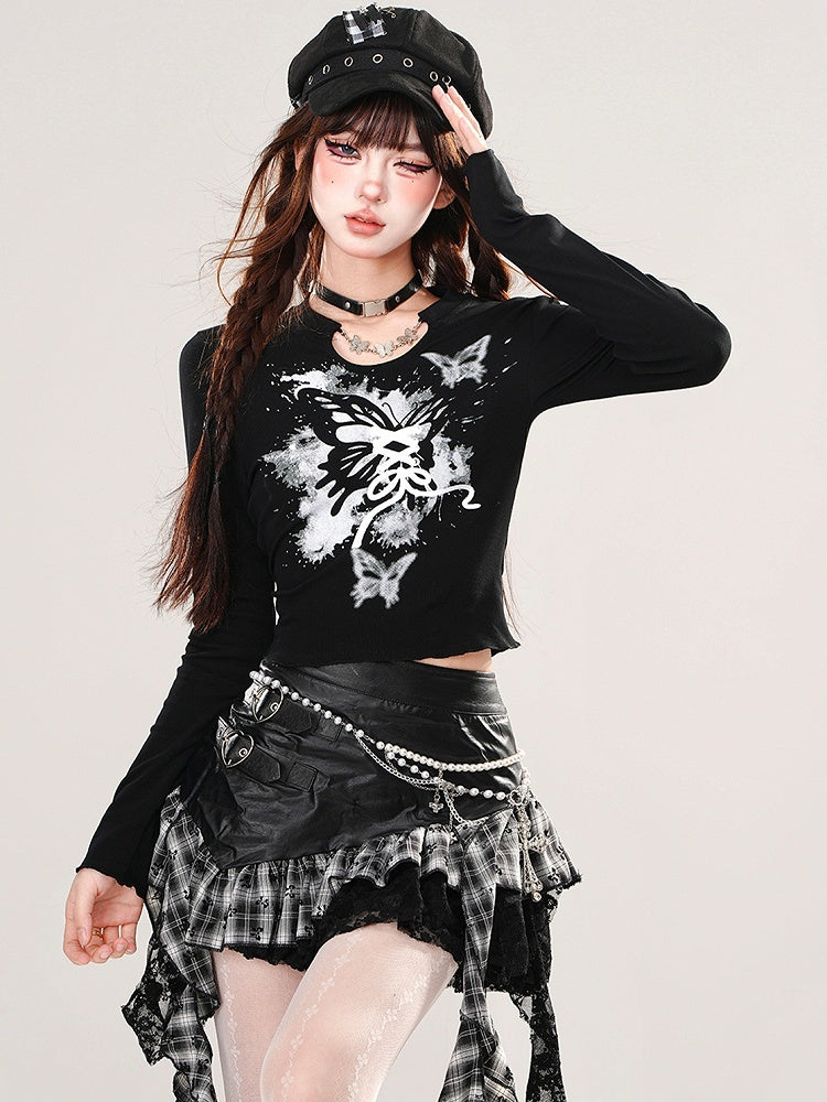 ブラック/ホワイトのレースとバタフライのバックグラフィッククロップドトップス