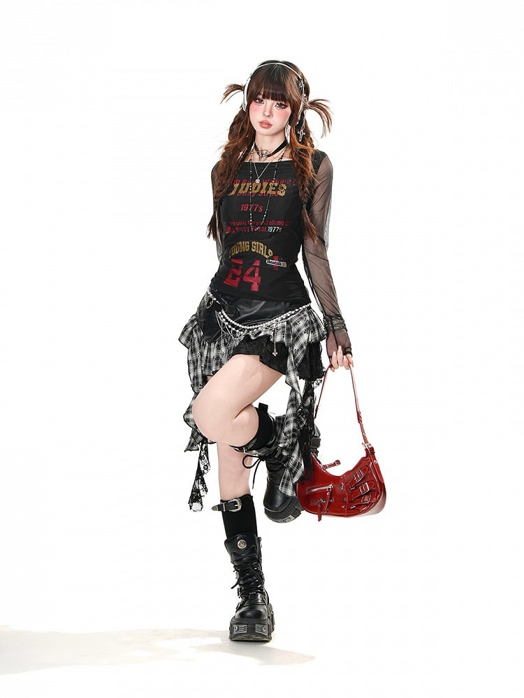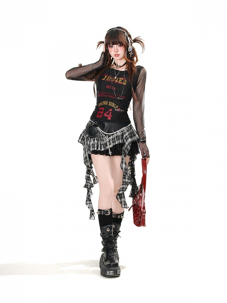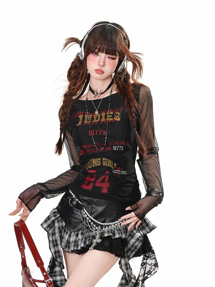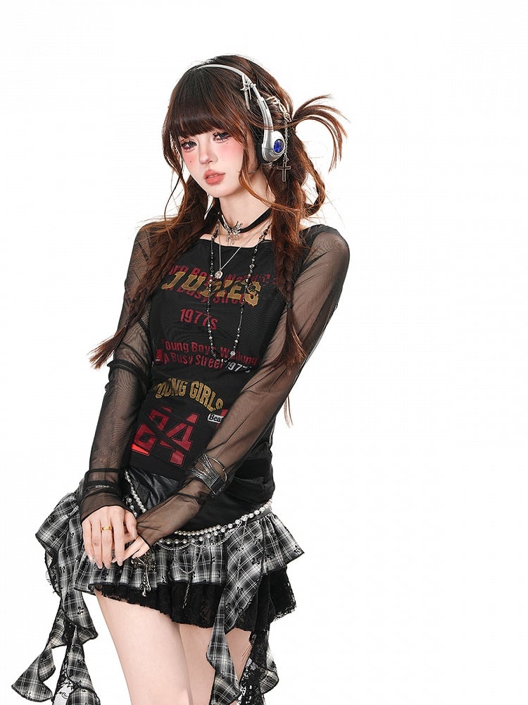 メッシュオーバートップ付きブラック/ホワイトナンバーグラマラストップス