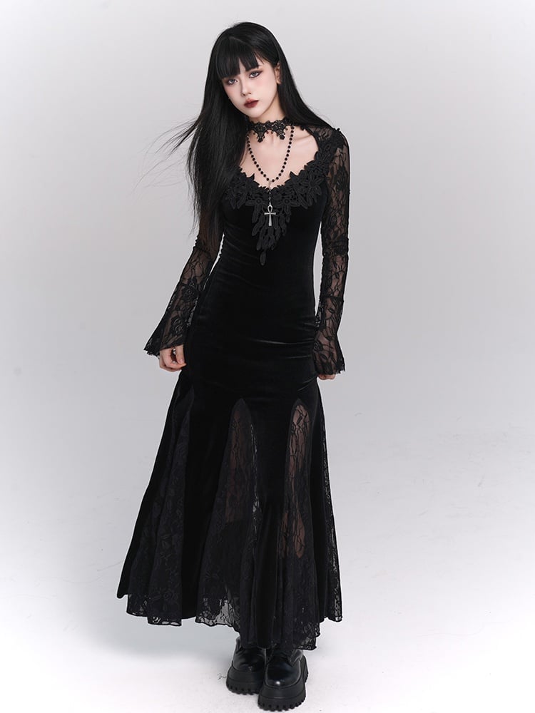 ブラック/ワインレッドゴシックレースベルスリーブベルベットマーメイドドレス