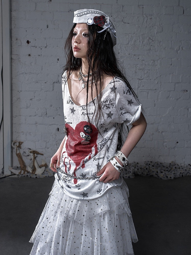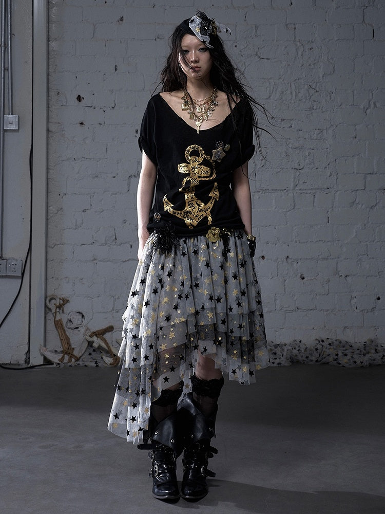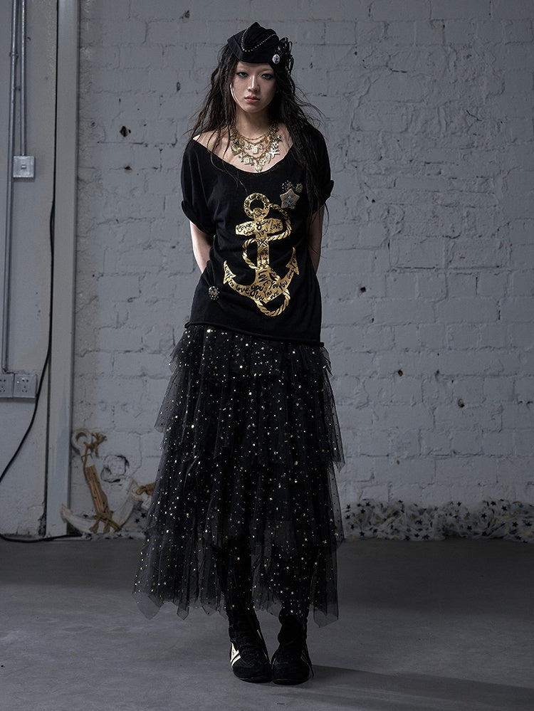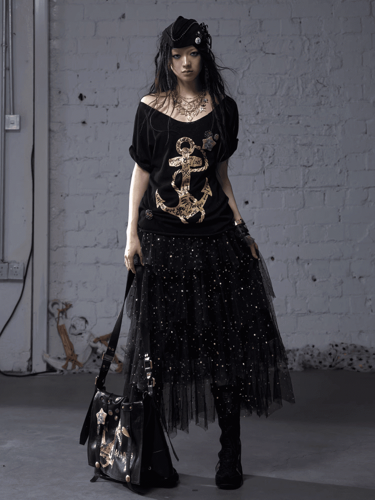ブラック/ホワイト ディストレストデザイン ネイビーコア グラフィック Tシャツ