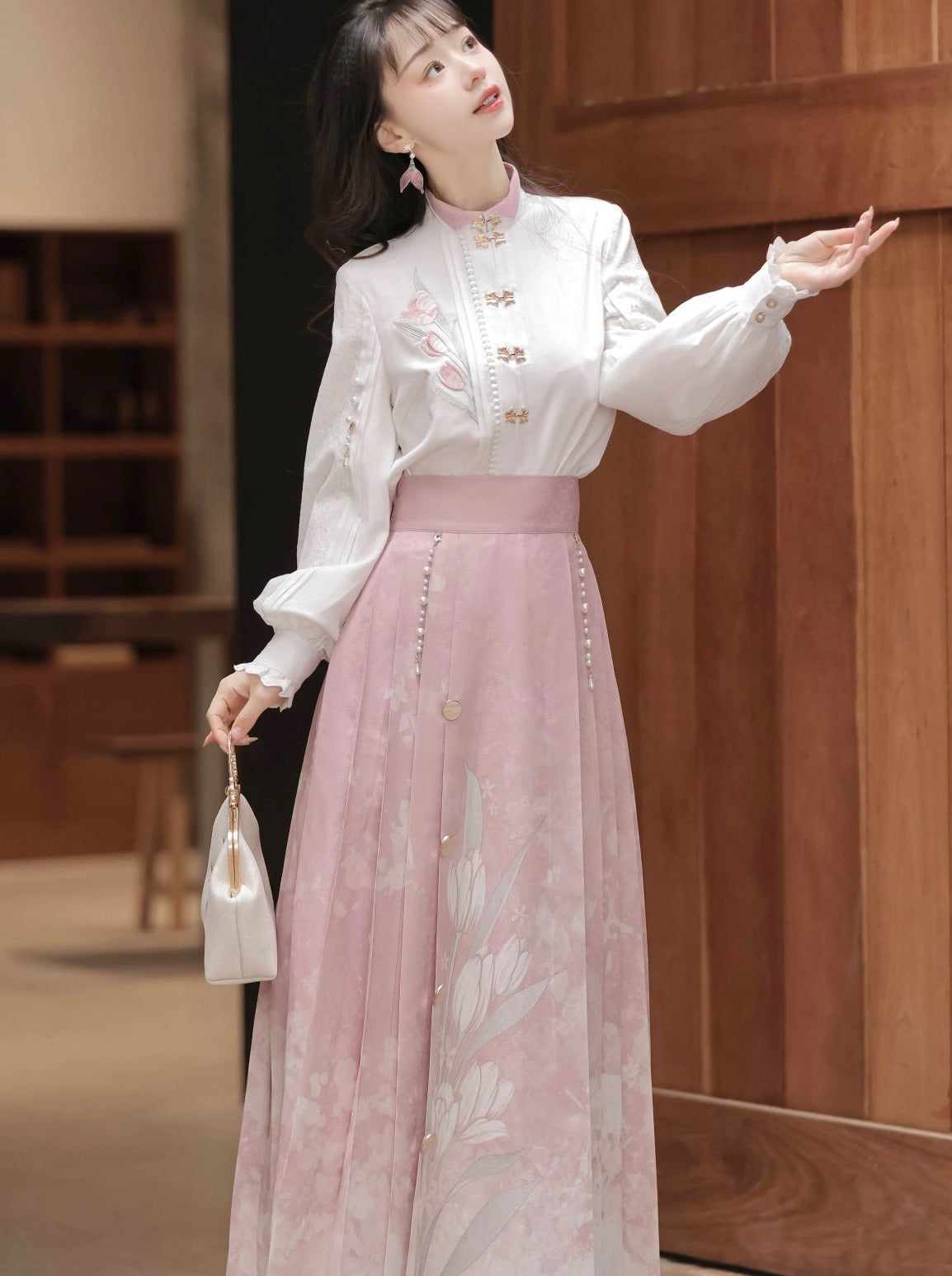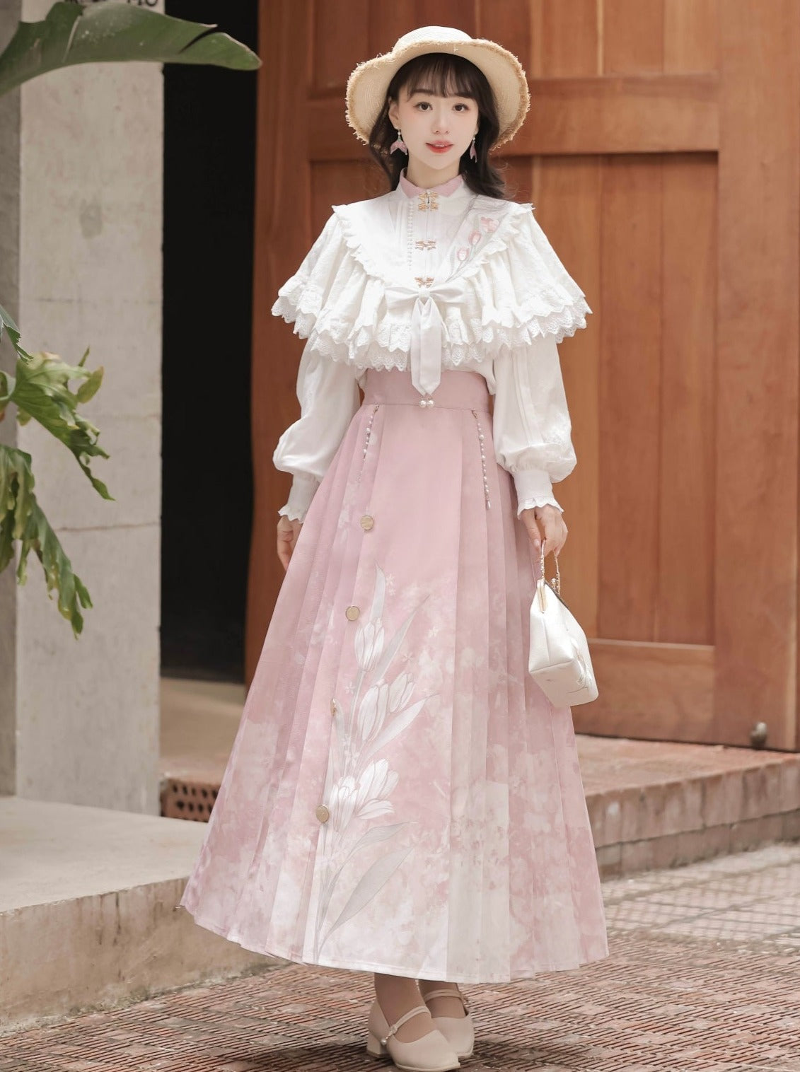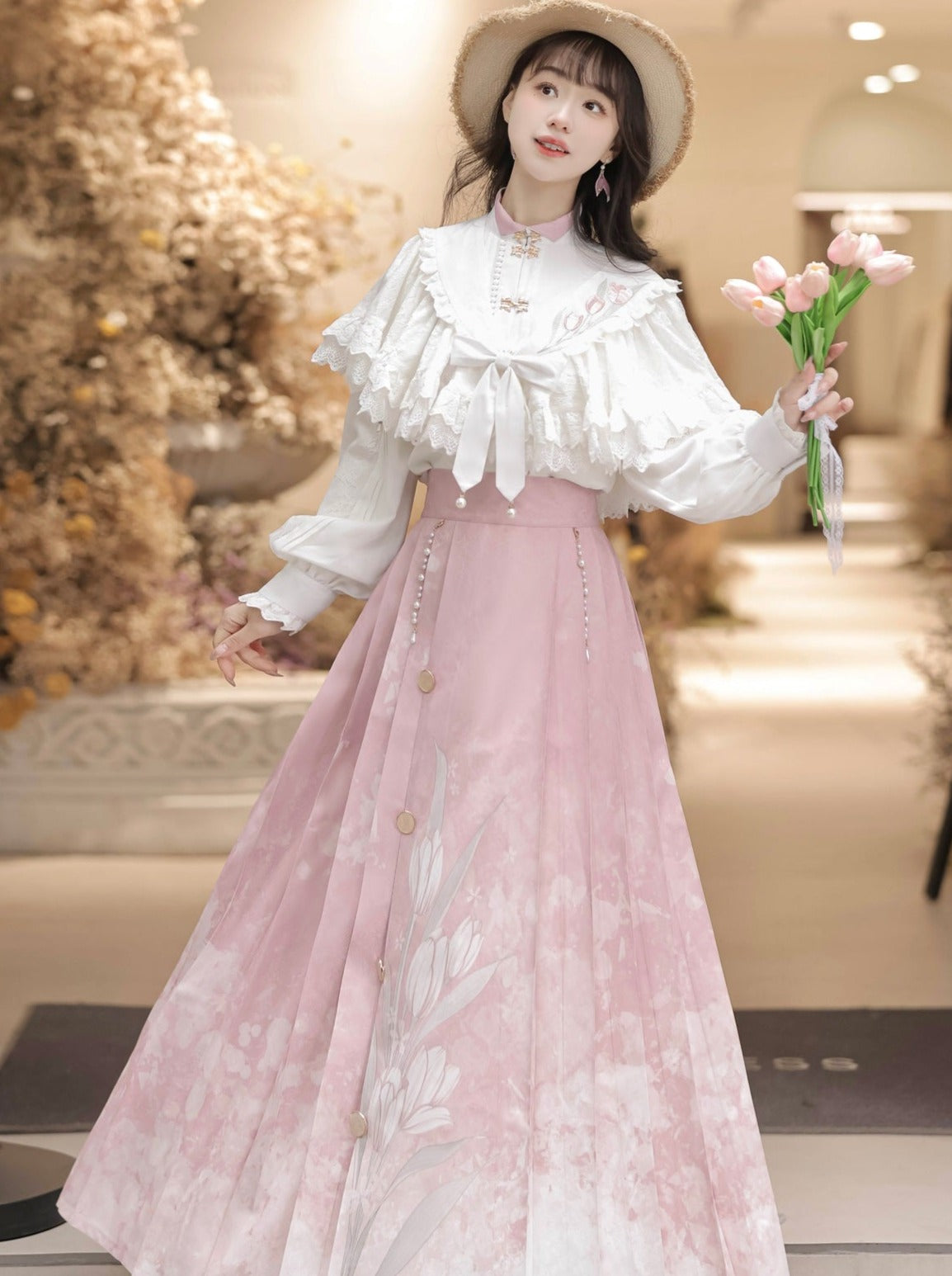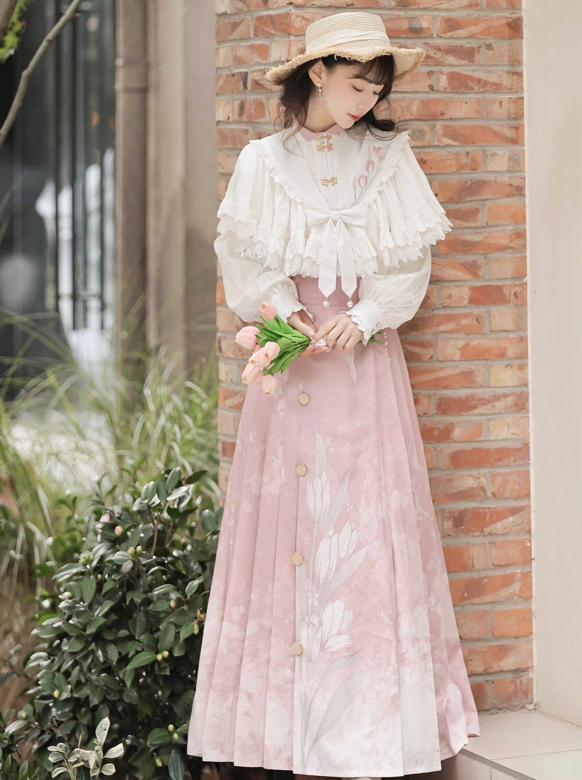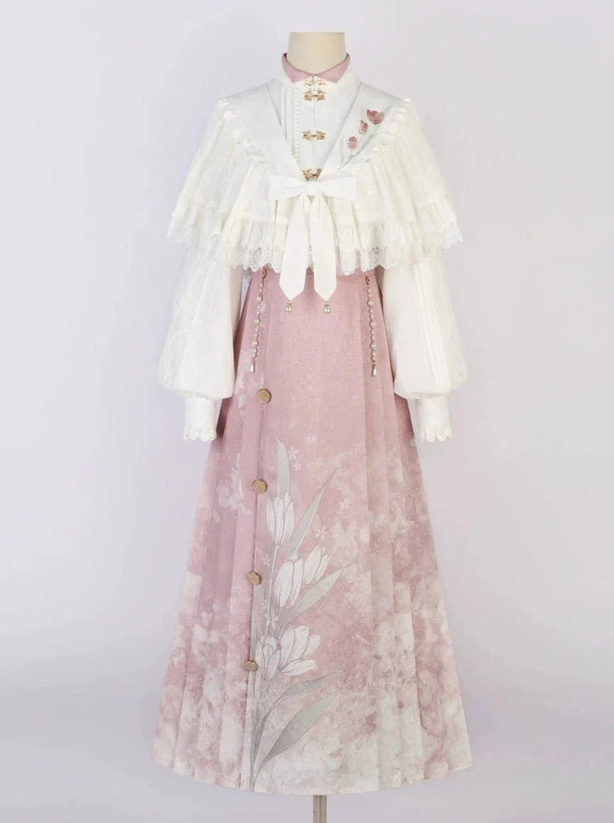 ブラウス プリーツショール リボンスカート チャイナ + スイートレース フローラル